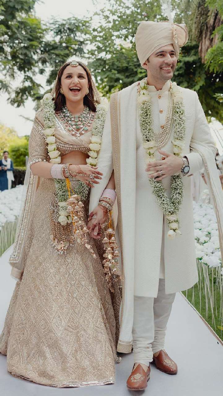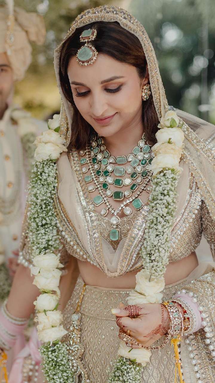हाल में 24 सितंबर को राघव चड्ढा संग शादी के बंधन में बंधी परिणीति चोपड़ा दुल्हन बनकर बेहद अट्रैक्टिव लग रही थीं। एक्ट्रेस ने पीच कलर के लहंगे के साथ ग्रीन कुंदन ज्वैलरी कैरी की हुई थी।