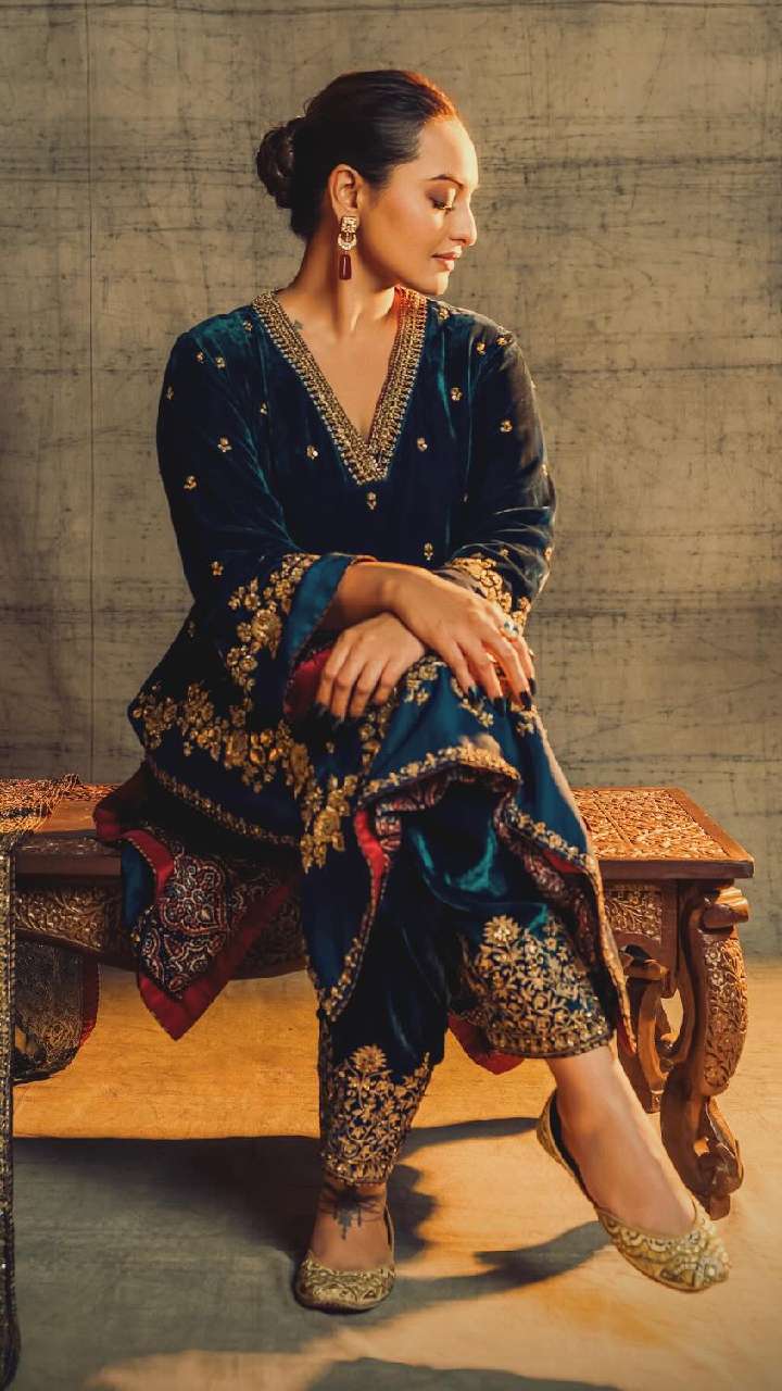 आप शादी में जाने के लिए सूट सर्च कर रही हैं, तो सोनाक्षी सिन्हा के इस लुक को रीक्रिएट कर सकती हैं। ब्लू कलर के वेलवेट प्लाजो सूट में एक्ट्रेस काफी सुंदर लग रही हैं।