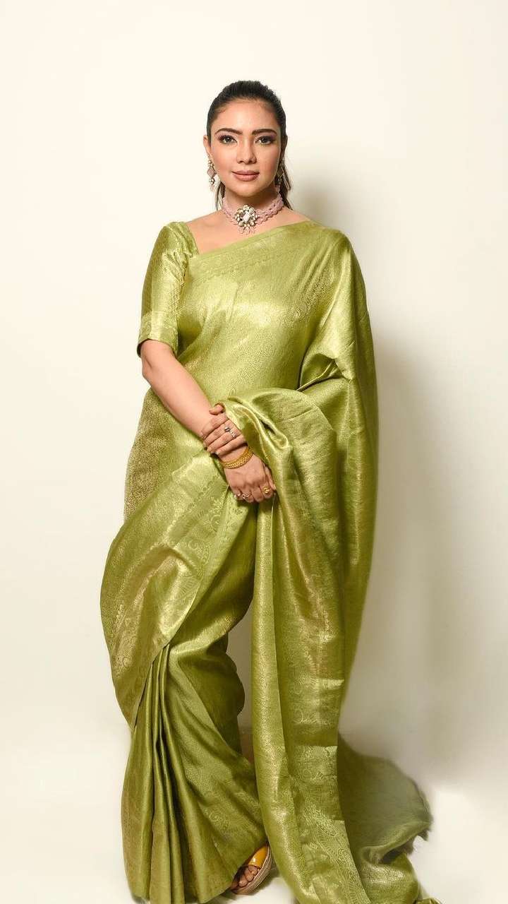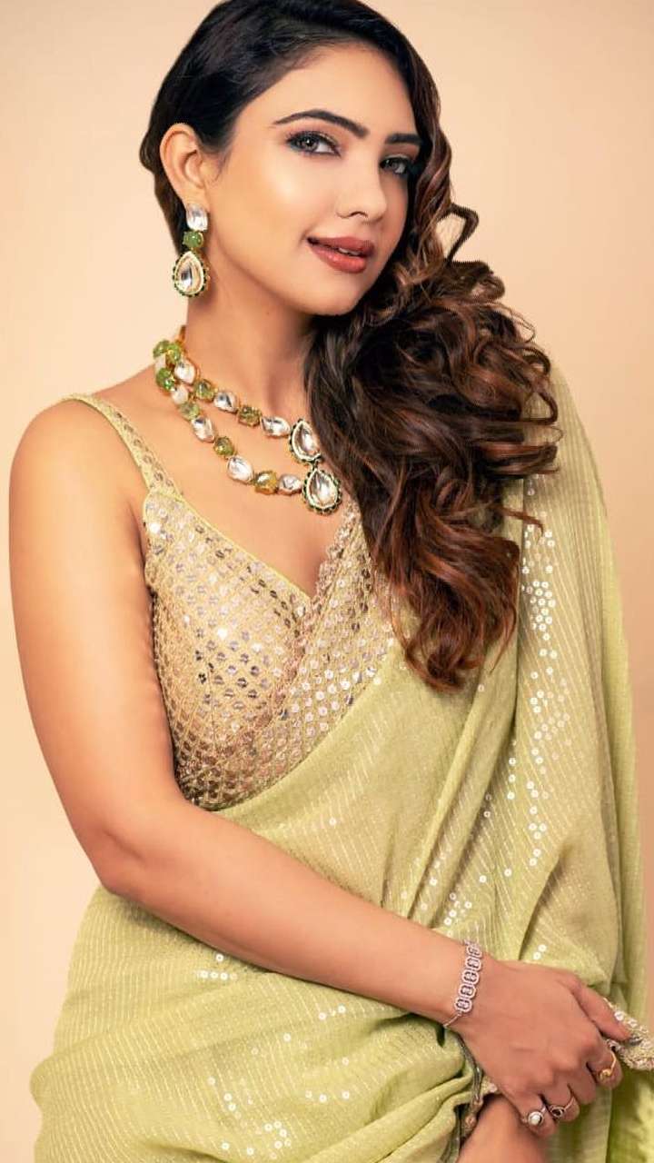 पूजा बनर्जी ग्रीन शिमरी साड़ी में बला की खूबसूरत लग रही हैं।