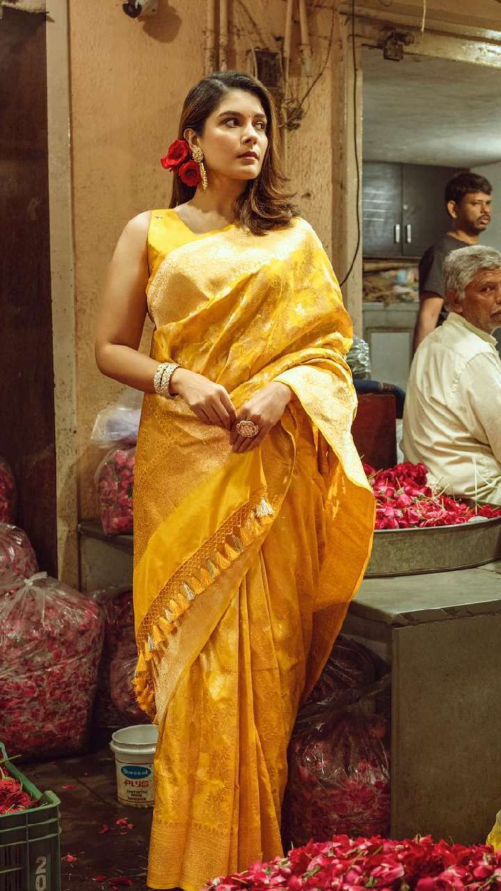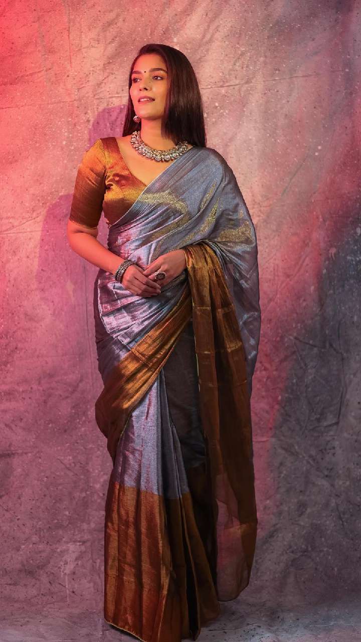 पूजा की ये साड़ी भी काफी शानदार लग रही हैं। इस साड़ी में हाफ बनारसी और हाफ टिश्यू का कॉम्बिनेशन है।