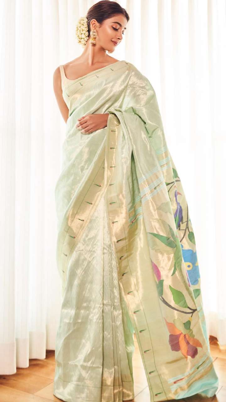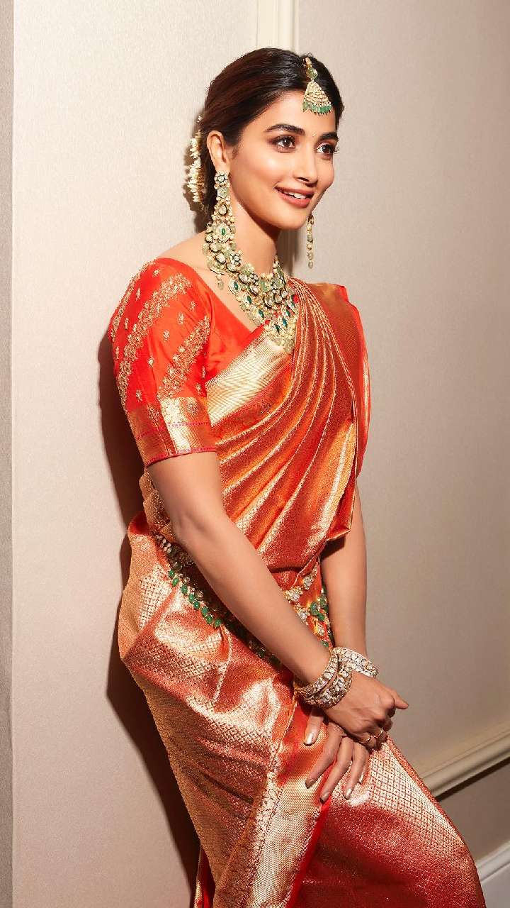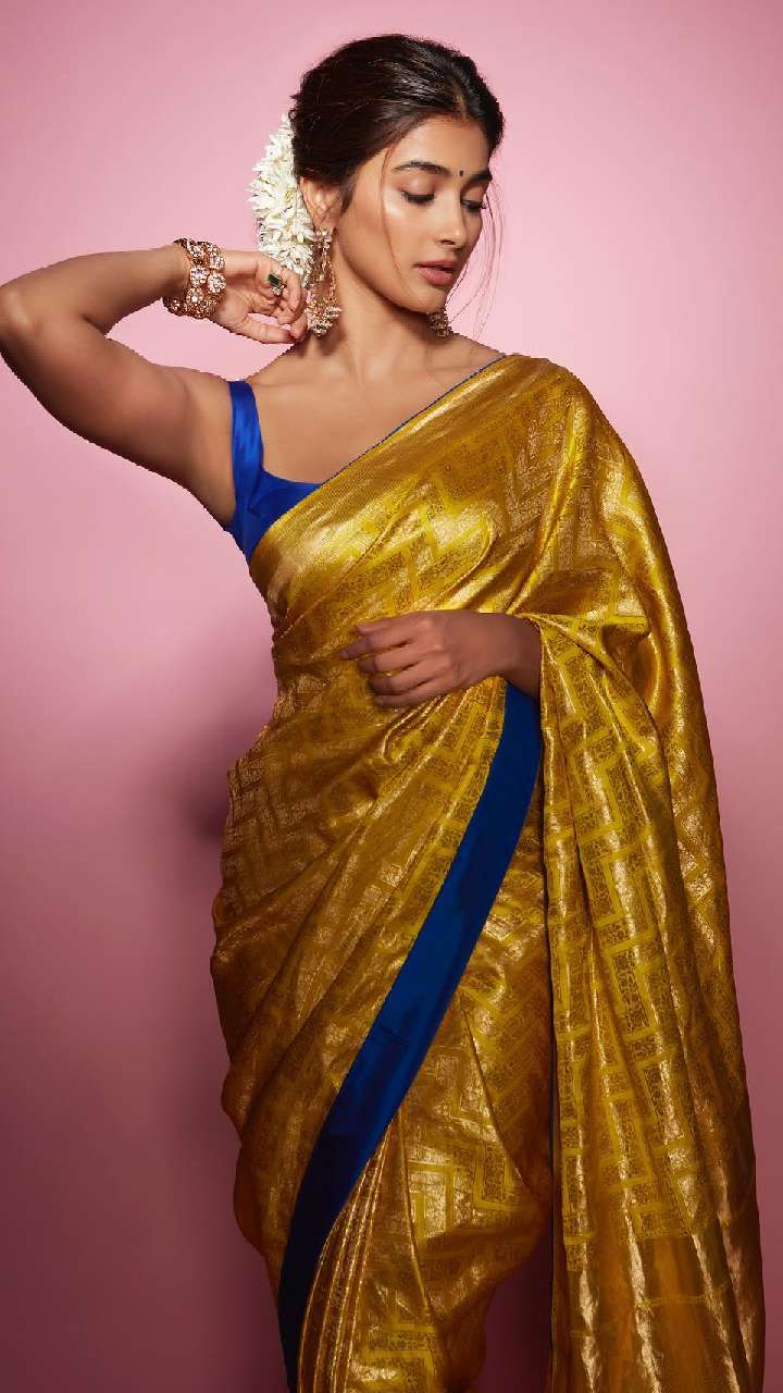 अगर आप अपने लुक को रॉयल बनाना चाहती हैं, तो पूजा हेगड़े की ये साड़ी बेस्ट है। उन्होंने येलो कलर की सिल्क साड़ी पहनी है, जिसमें वह काफी क्लासी और रॉयल लग रही हैं।