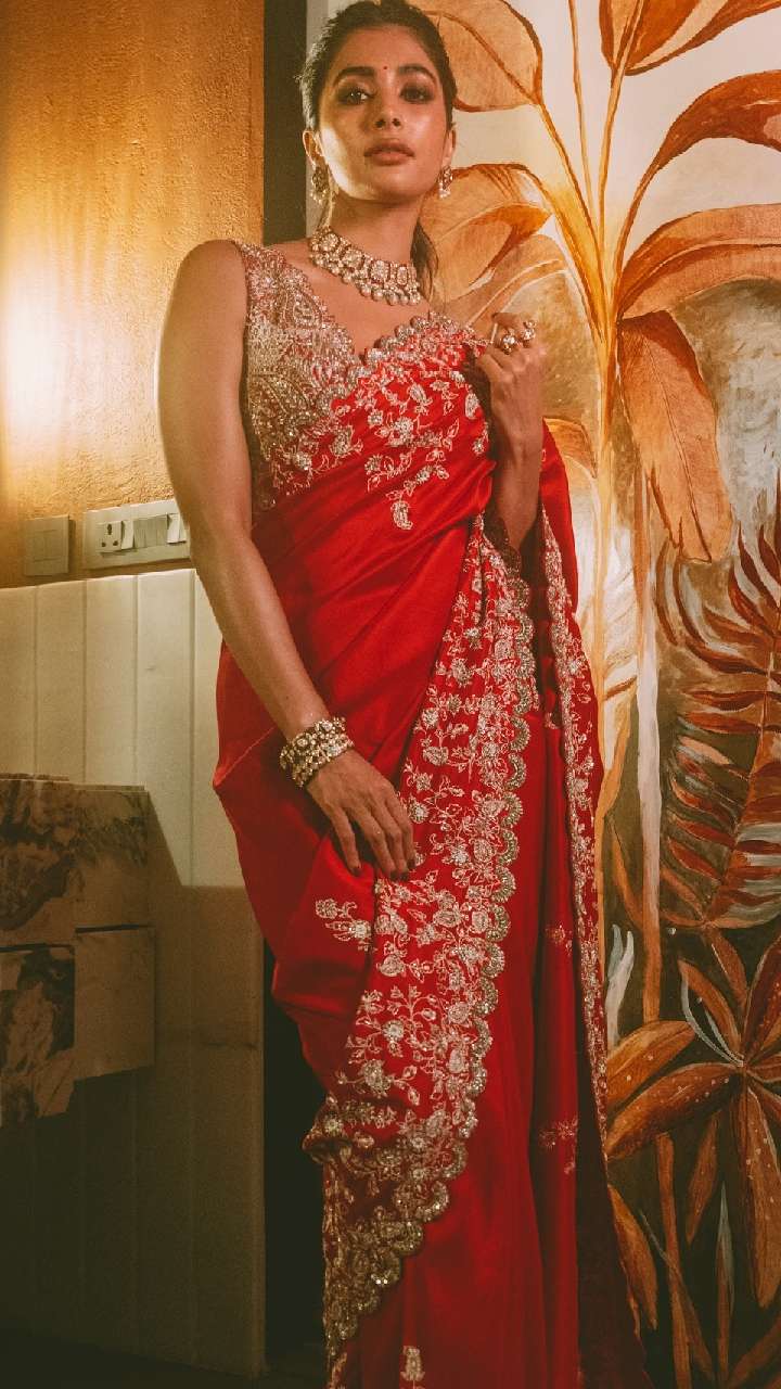 पूजा रेड कलर के रेडी टू वियर साड़ी में एलीगेंट लग रही हैं। इस तरह की साड़ी को स्टाइल करना काफी आसान होता है। आप भी ऐसी साड़ी किसी पार्टी या फंक्शन में कैरी कर सकती हैं।