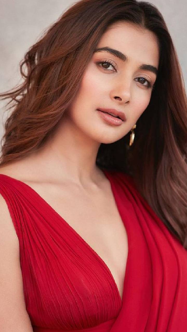 पूजा हेगड़े रेड रफल साड़ी में बला की खूबसूरत लग रही हैं।