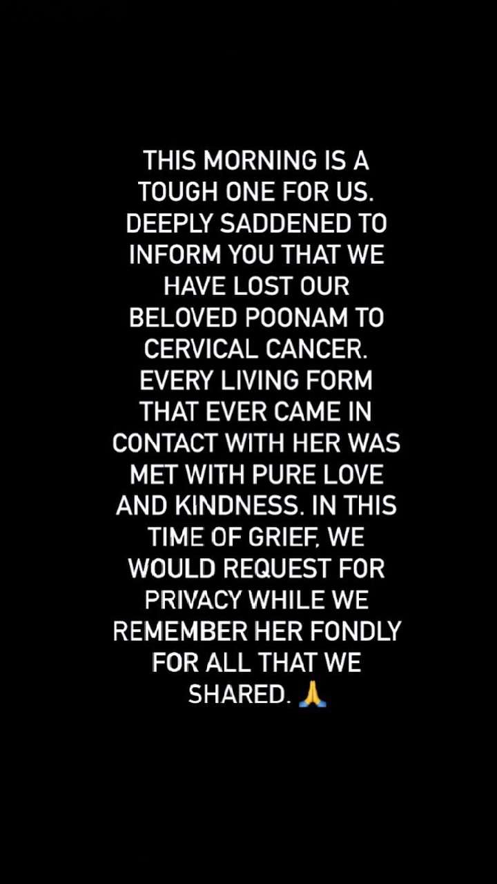 2 फरवरी को पूनम पांडे के सोशल मीडिया अकाउंट पर इस बात का जानकारी आई थी। अकाउंट पर एक पोस्ट शेयर किया गया जिसमें बताया कि अब पूनम नहीं रहीं। वहीं कई लोगों का कहना है कि उनका अकाउंट हैक हो गया है।