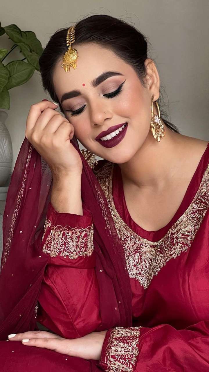 एक्ट्रेस ने नूडल स्ट्रैप वाले स्वीटहार्ट शिमरी ब्लाउज को पहना हुआ हैं। आप इस ब्लाउज को लहंगे या डिजाइनर साड़ी के साथ पहन सकती हैं। डार्क रेड लिपस्टिक आपको हुस्न की महिला जैसा लुक देगी।