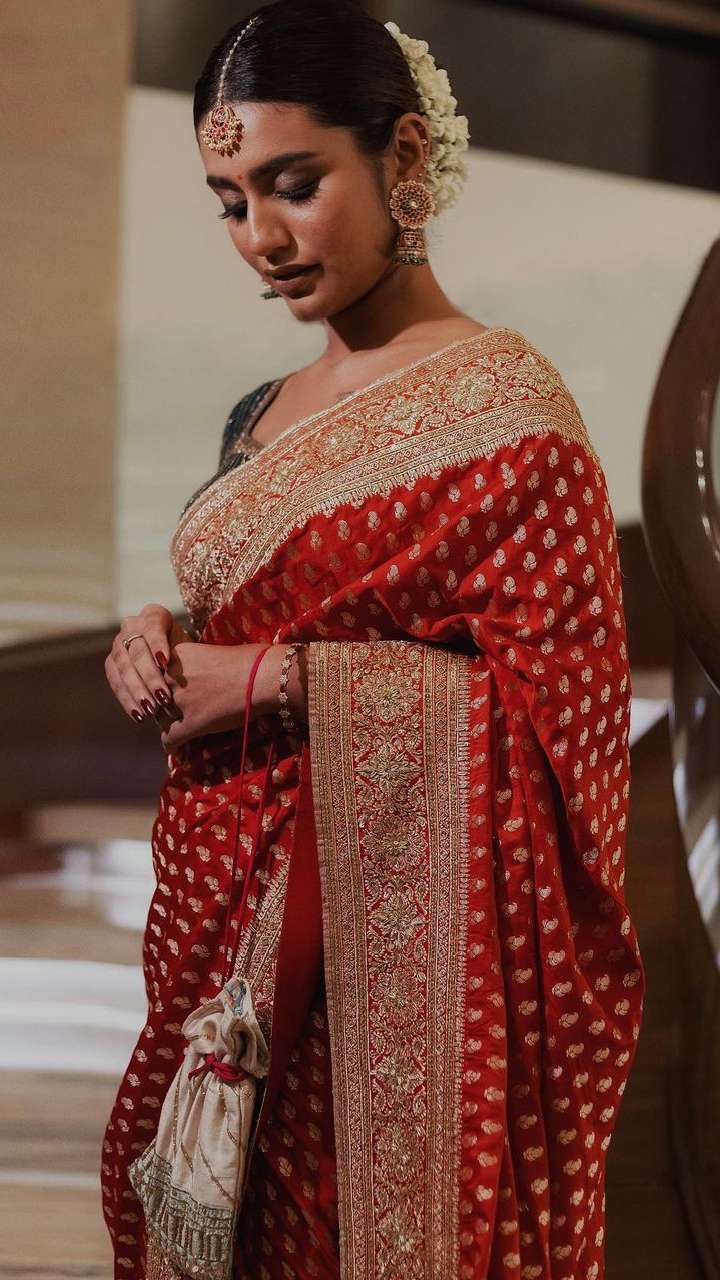 प्रिया का इस लाल कलर की बनारसी साड़ी बालों में गजरा, माथे पर टीका, कानों में झुमकी वाला लुक वेडिंग के लिए एकदम परफेक्ट हैं।
