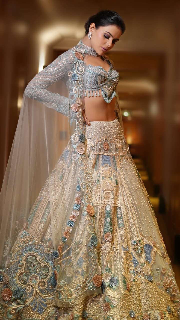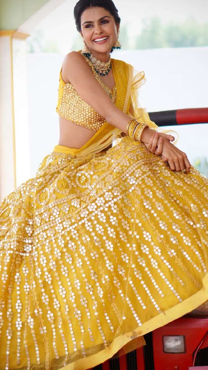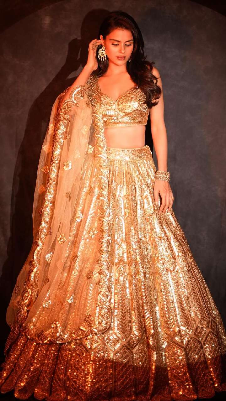 वेडिंग में होने वाली रिस्पेशन पार्टी में प्रियंका का गोल्डन शिमरी लहंगा डीपनैक चोली यंग गर्ल्स को हॉट बना देगी।
