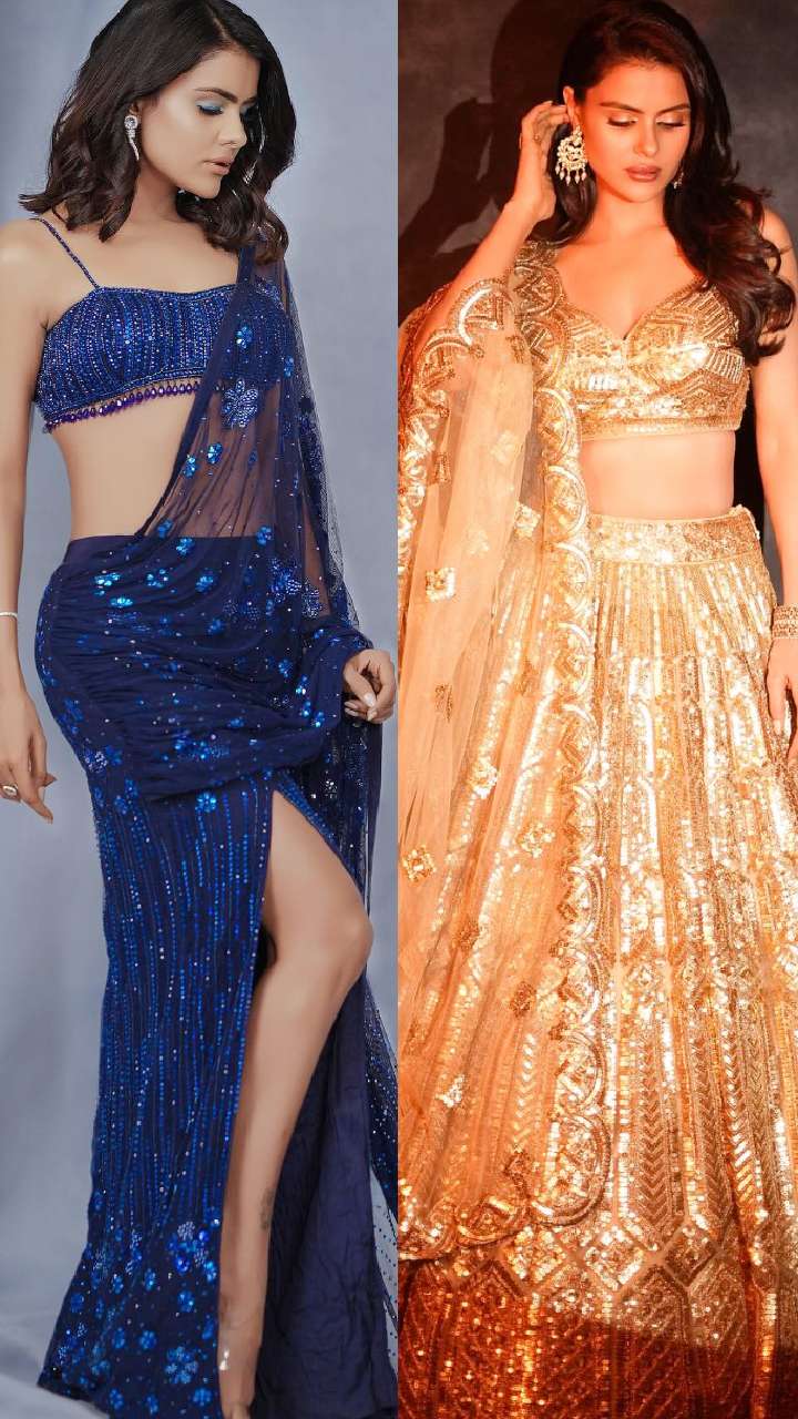 ब्लू कलर की नेटिड शिमरी इंडो-वेस्टर्न साड़ी पर्ल वर्क नूडल स्ट्रैप ब्लाउज में डीवा काफी बोल्ड अंदाज में नजर आ रही हैं।