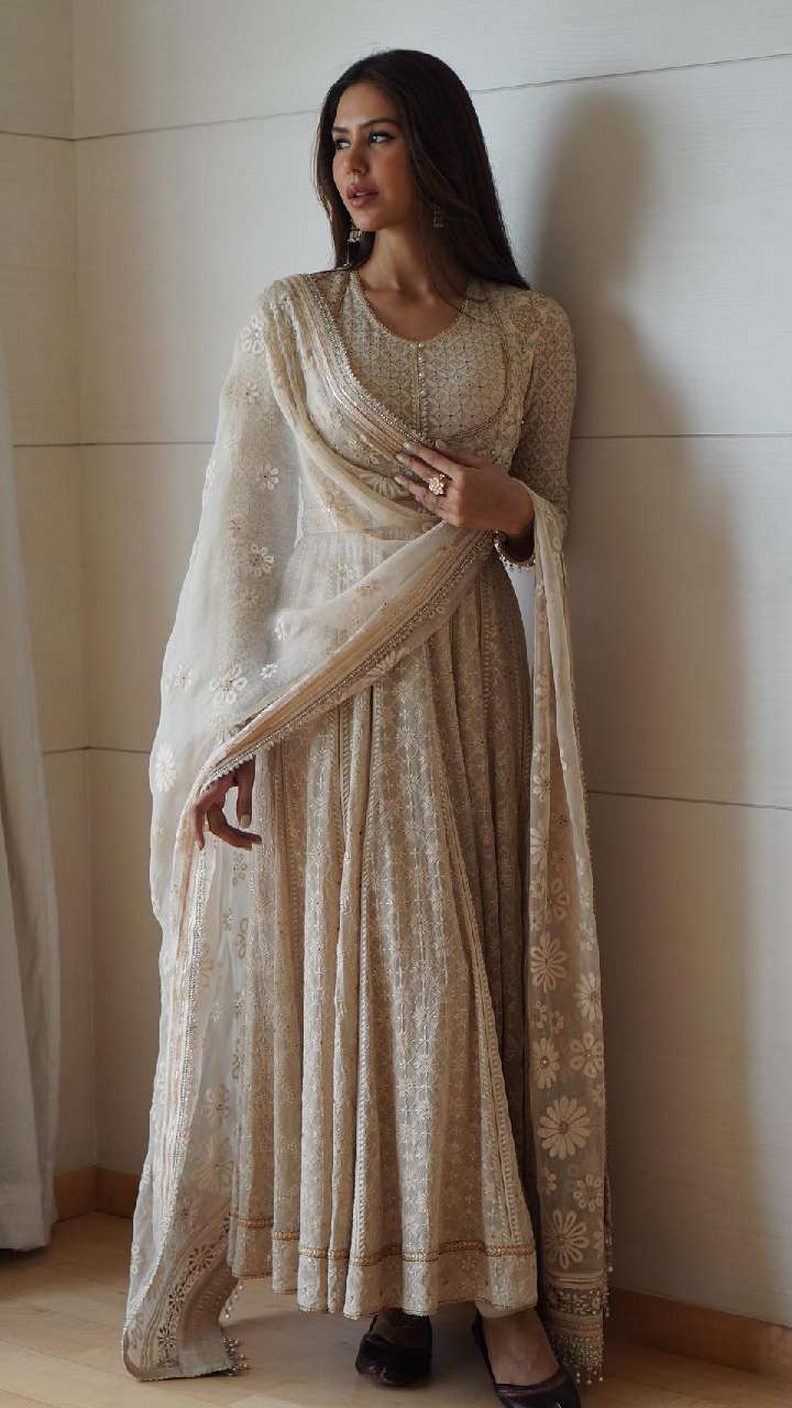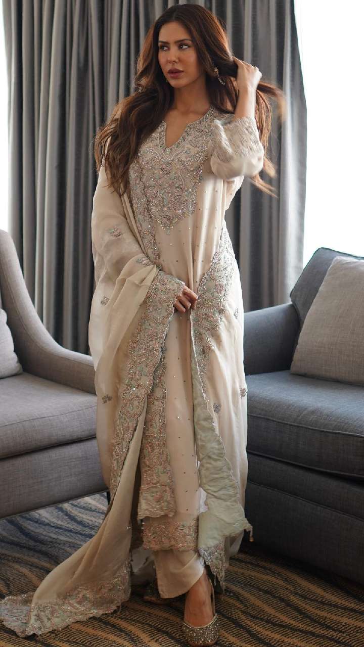 ऑफ व्हाइट कलर के सूट में सोनम बाजवा का ये लुक काफी रॉयल लुक दे रहा है। आप इस तरह के सूट को हर मौके पर कैरी कर सकती हैं।