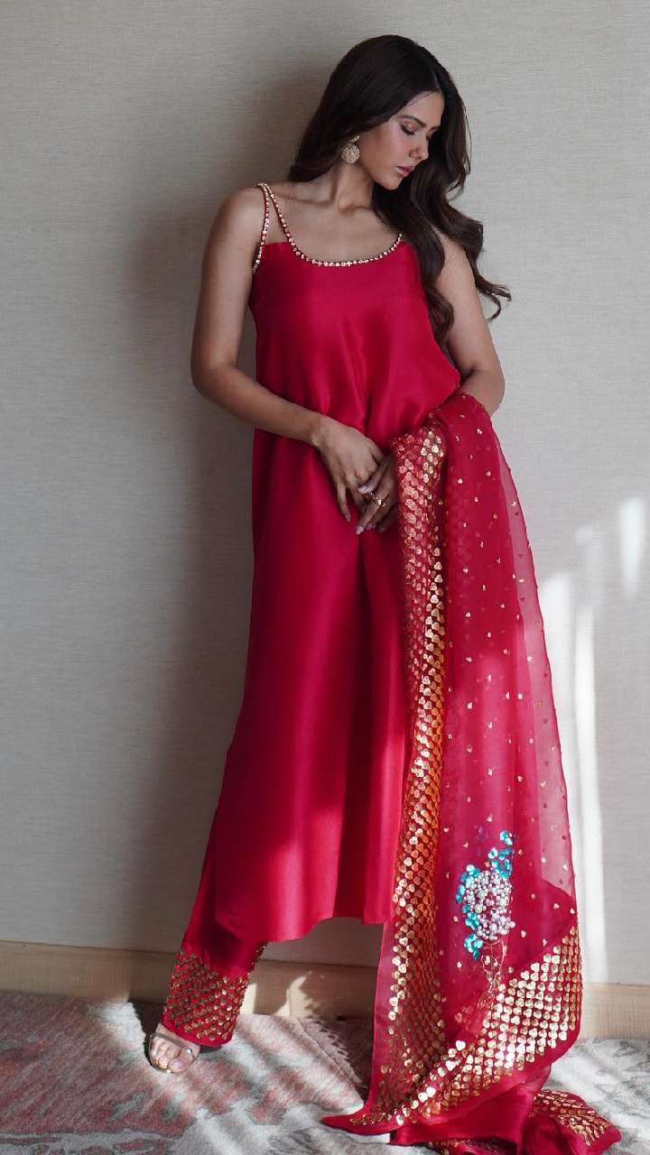 रेड कलर के इस सिंपल सोबर लुक में सोनम बाजवा काफी ज्यादा हॉट लग रहीं हैं। अगर आप सिंपल लुक पसंद करती हैं तो ये सूट बेस्ट है।