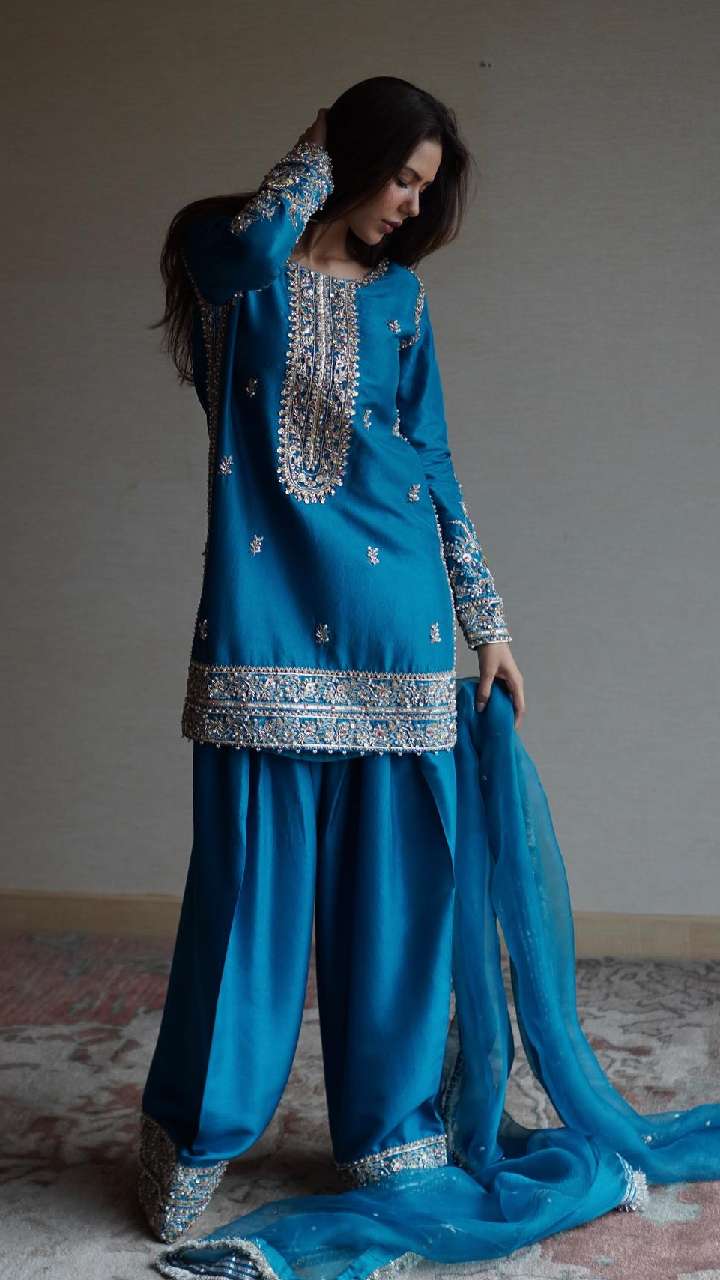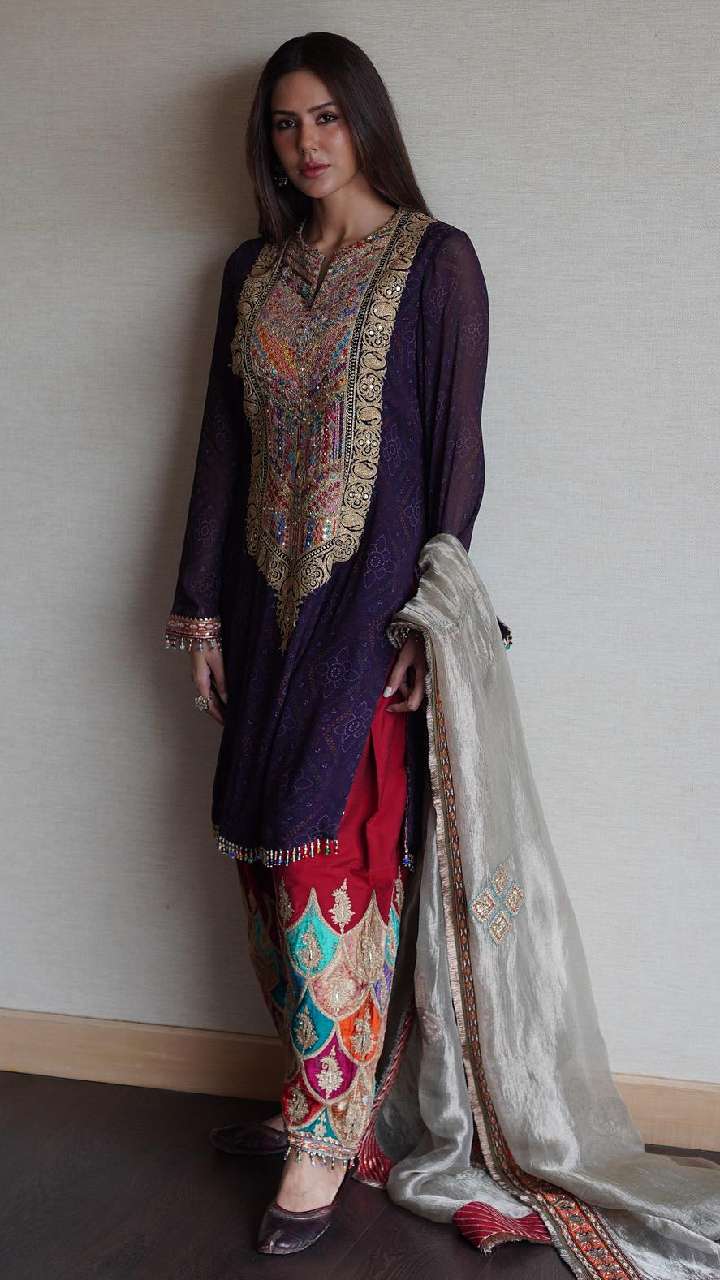 इस ब्लू कुर्ती मरून पटियाला पजामी विद मल्टीकलर कढ़ाई सूट में सोनम काफी क्लासी लुक दे रही हैं।