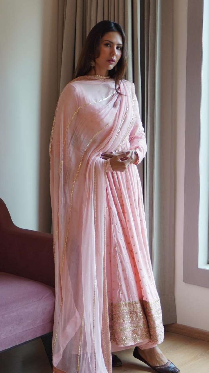 सोनम का पिंक प्रिंटेड अनारकली कुर्ती के साथ मस्टर्ड येलो दुपट्टा कॉम्बिनेशन काफी जंच रहा है। इसे आप किसी भी फंक्शन में पहन सकती हैं।