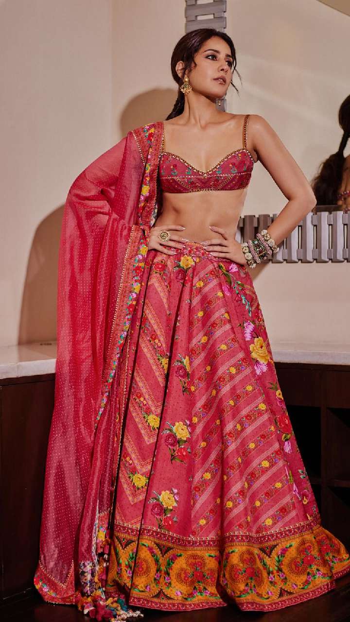 अभिनेत्री पिंक कलर के फ्लोरल प्रिंट लहंगे स्ट्रैपी ब्रॉड नेक चोली में कहर ढहा रही हैं। इस लहंगे में आपको देख पति की नजर नहीं हटेंगी।