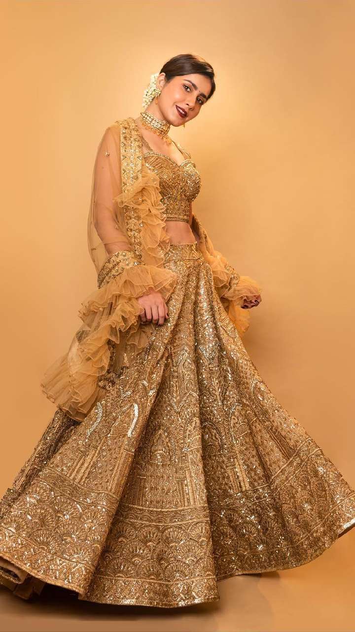 ब्राइडल या कोई भी वेडिंग सीजन में इस तरह के ग्लिटरी गोल्डन हैवी लहंगे स्ट्रैपी चोली से खुद को ग्लैमरस बना सकता है।
