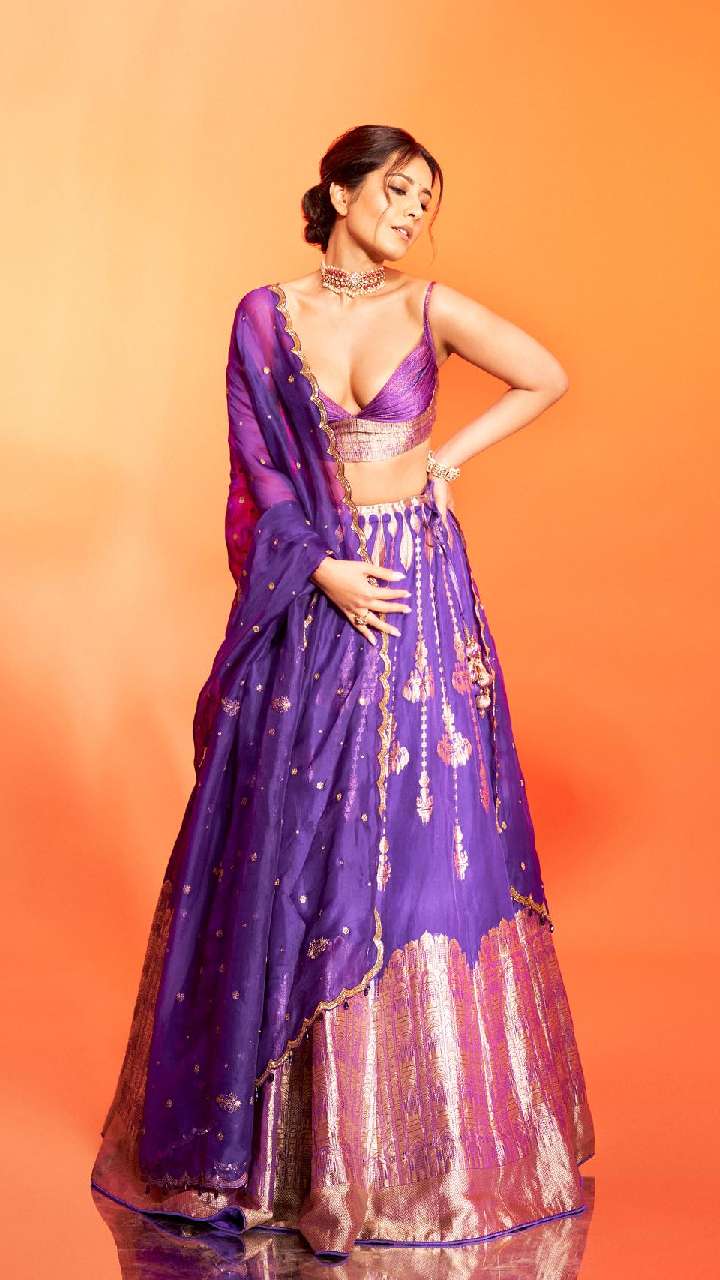 पति को दीवाना बनाना है तो राशि के पर्पल कलर बनारसी लहंगे नूडल स्ट्रैप चोली को कॉपी जरूर करें।