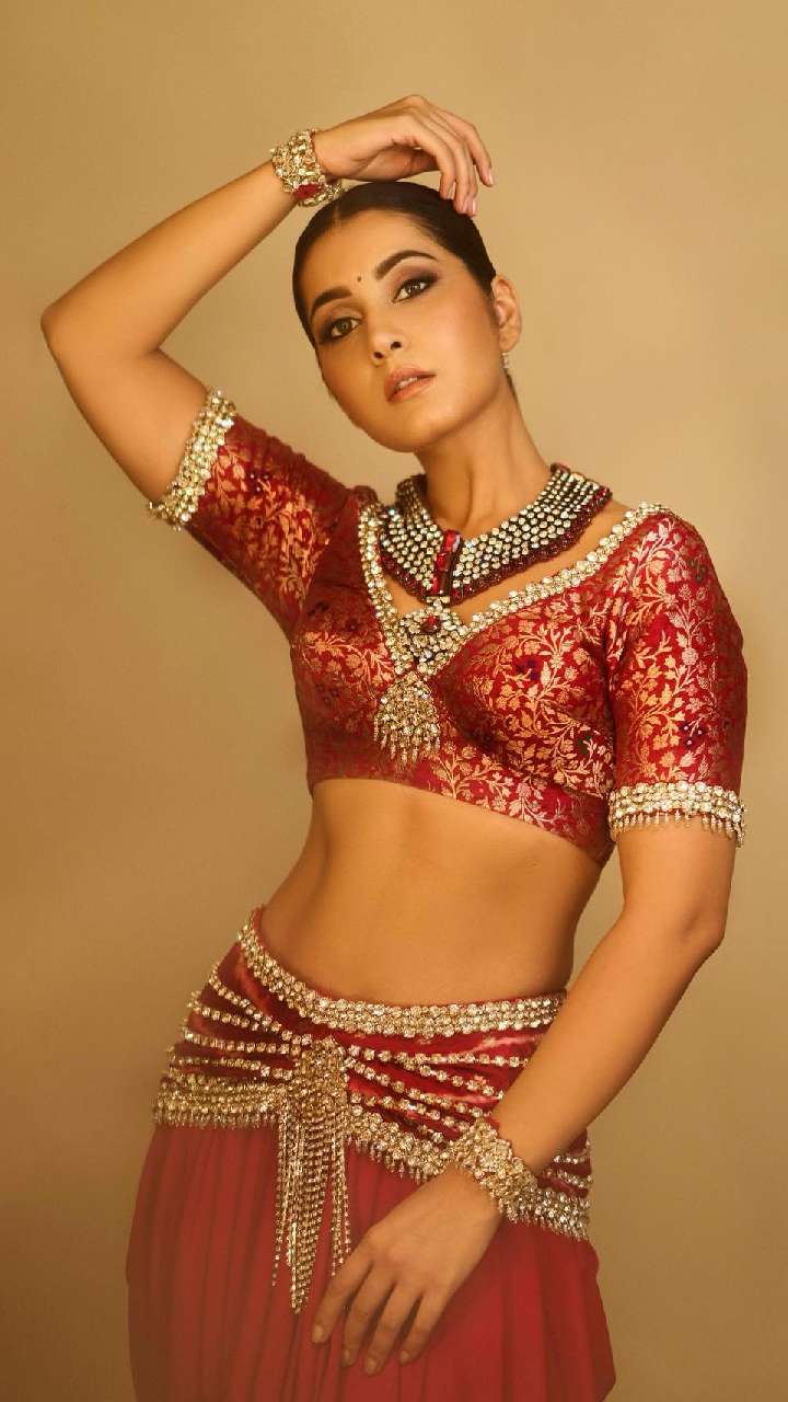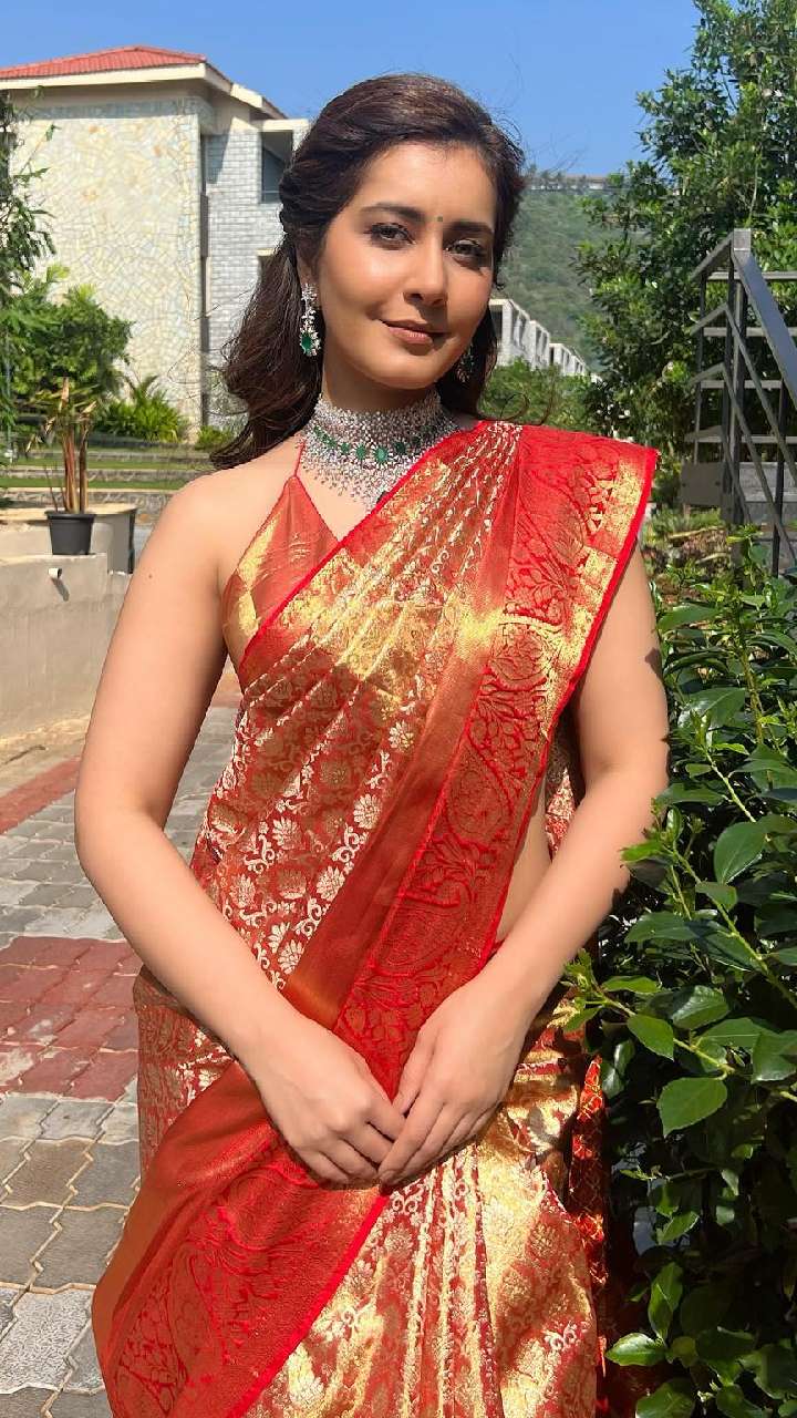 राशि खन्ना का ये रेड साड़ी लुक भी शानदार है। रेड सिल्क साड़ी के साथ राशि ने हॉट ब्लाउज कैरी किया है।