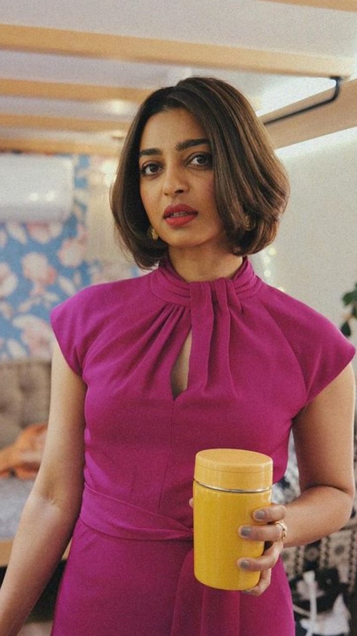 राधिका आप्टे ने पिंक कलर की कट आउट ड्रेस पहनी हुई हैं और जुड़ा बनाया हुआ है।