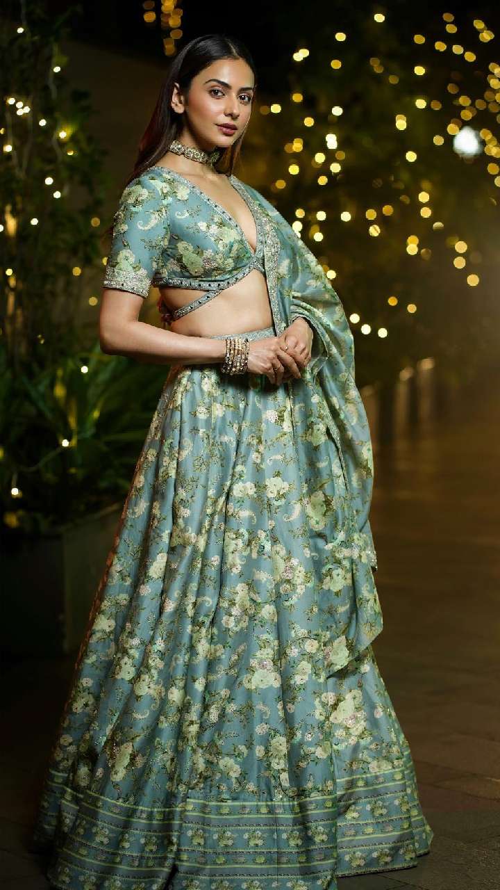 वेडिंग या किसी भी फंक्शन में एक्ट्रेस के जैसे फ्लोरल प्रिंट सिल्क लहंगे बिकिनी कट चोली काफी स्टाइलिश लगते हैं।