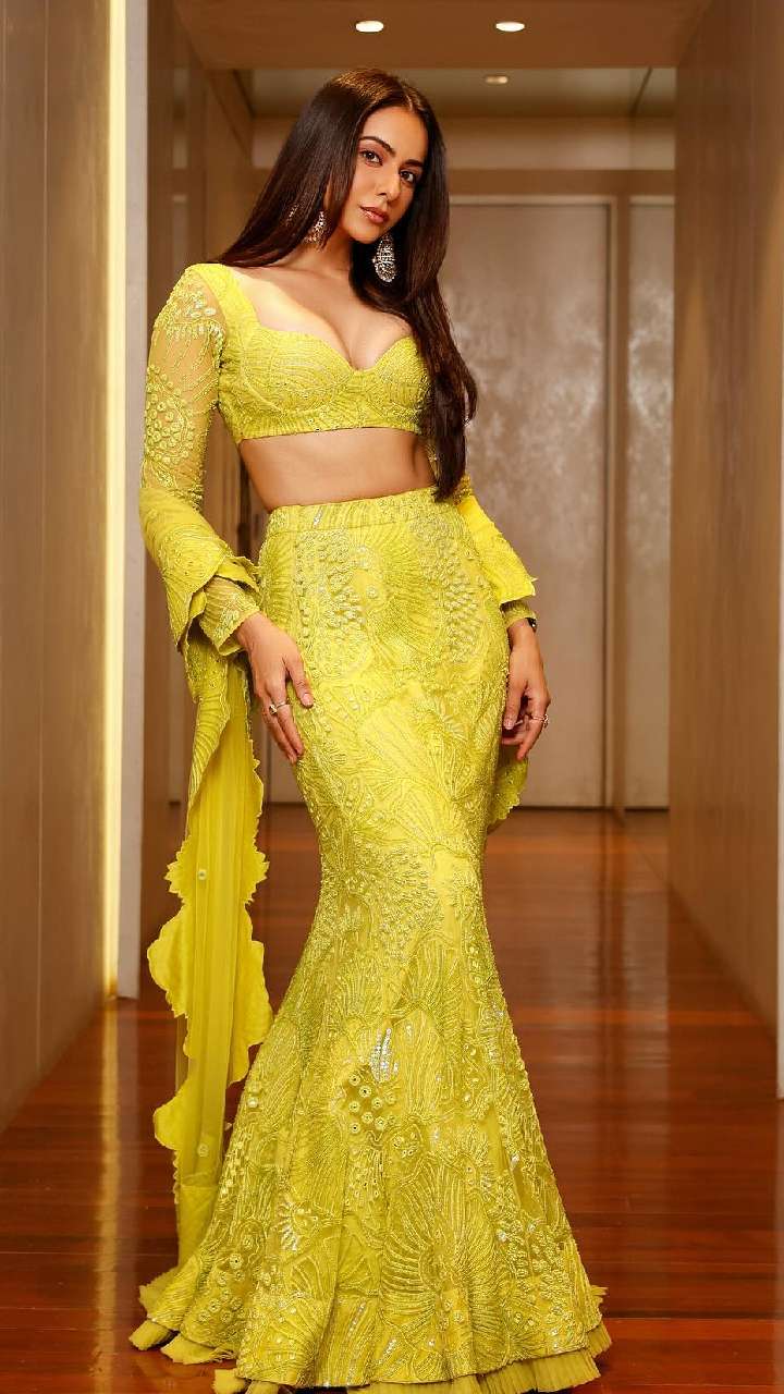 रकुल प्रीत इस येलो कलर के फिश कट लहंगे में अपना परफेक्ट फिगर फ्लॉन्ट कर रही हैं। हल्दी सेरेमनी के लिए ये लुक बेस्ट है।