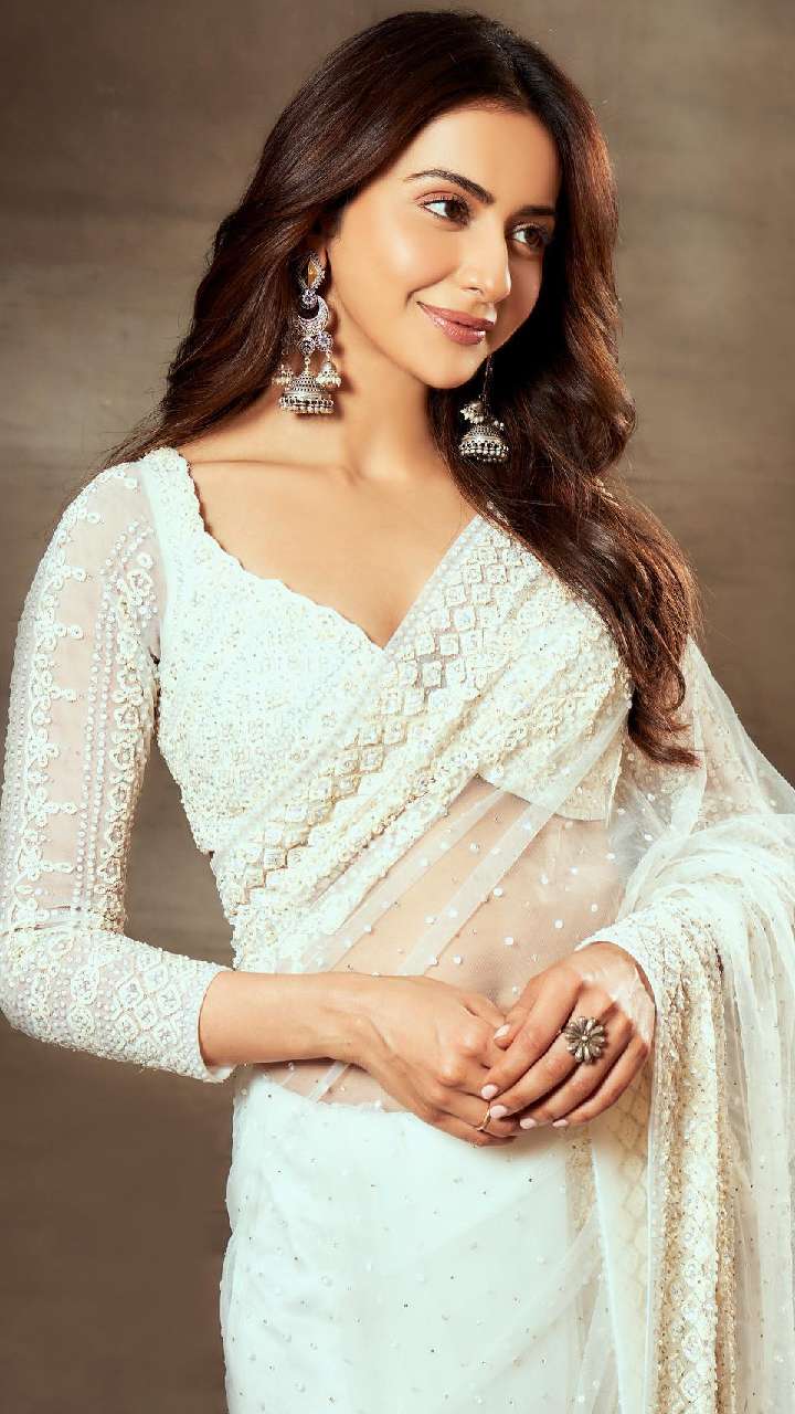 अगर आप स्लीवलेस पहनना पसंद नहीं करती हैं तो आप रकुल के इस व्हाइट ब्लाउज लुक को कैरी कर सकती हैं।
