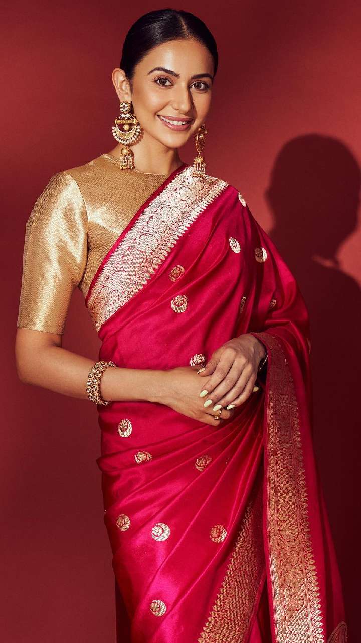 गोल्डन कलर का ये ¾ स्लीव्स वाला ब्लाउज रकुल के साड़ी लुक को रॉयल बना रहा है।