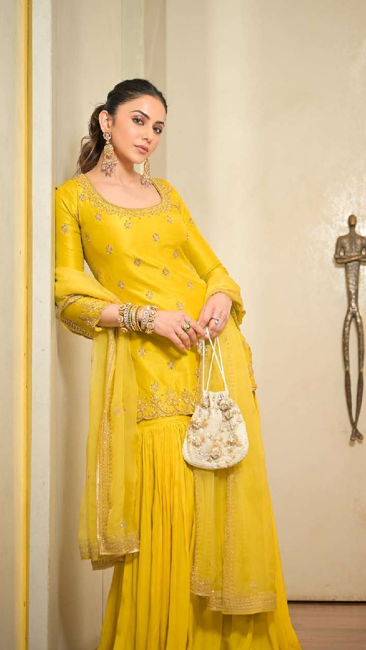 .येलो कलर के सूट में रकुल प्रीत सिंह काफी ज्यादा खूबसूरत लग रहीं हैं। शरारा सूट के साथ एक्ट्रेस ने पोटली पेयर की है।