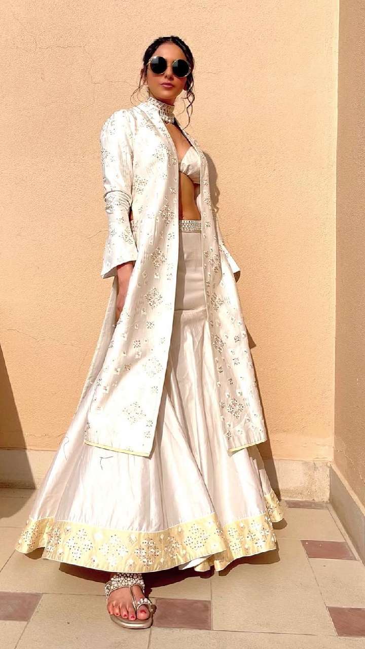 इस ऑल व्हाइट साटन श्रग अटायर मे अभिनेत्री एकदम फेस्टिव लुक दे रही हैं।