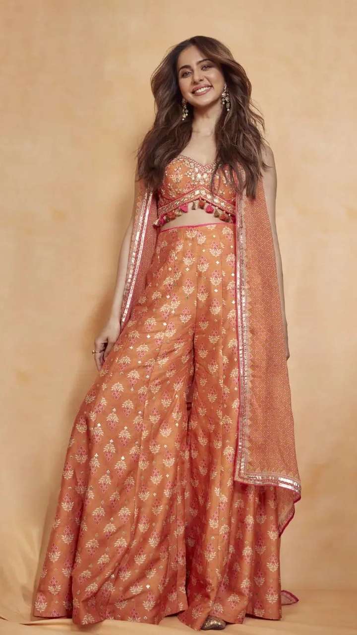 इस ऑरेंज कलर की मिरर वर्क चोली इंडो वेस्टर्न ड्रेस में रकुल काफी स्मार्ट लुक दे रही हैं।