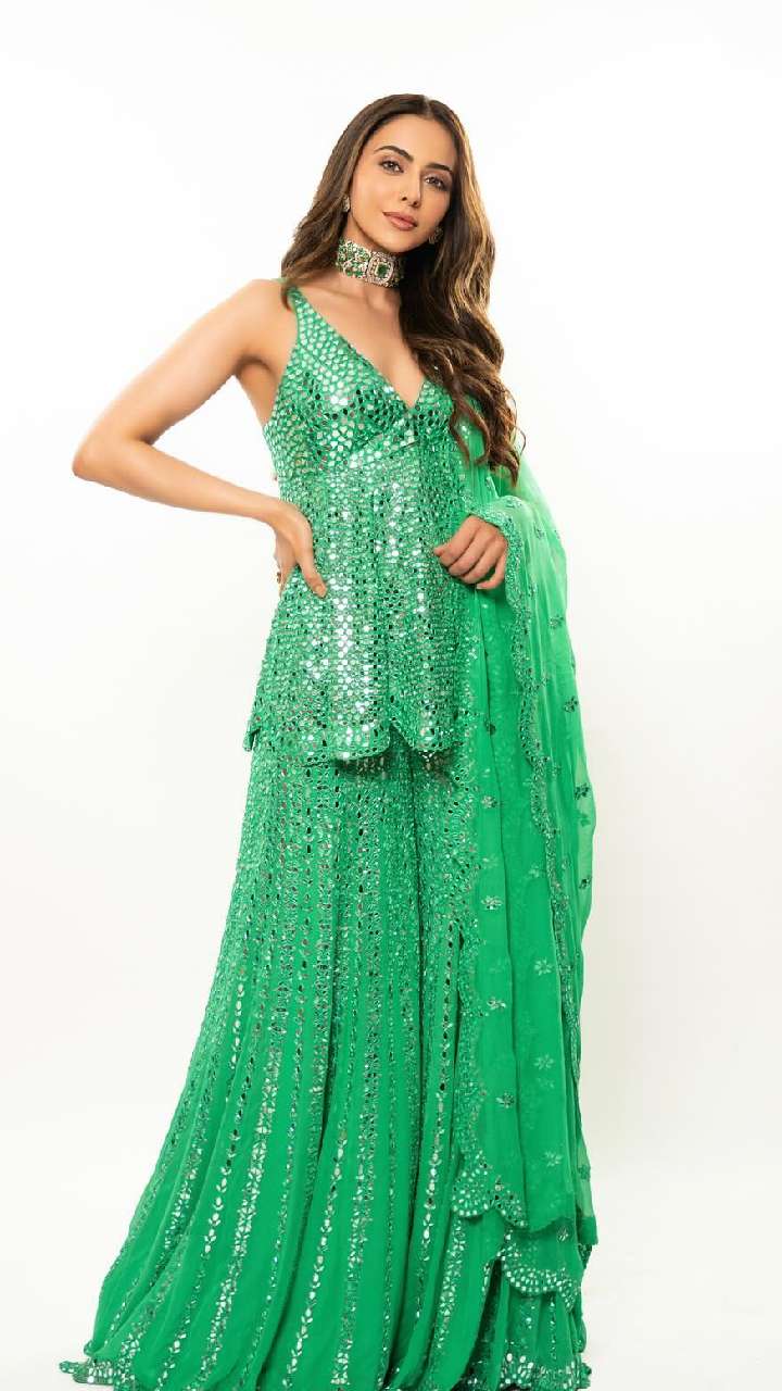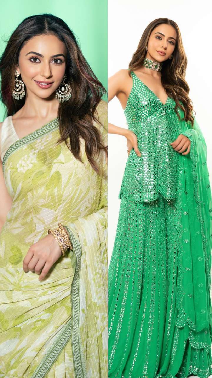 बहुत जल्द हरियाली तीज का त्यौहार आने वाला है। ऐसे में न्यूली मैरिड रकुल प्रीत के डिफरेंट ग्रीन ऑउटफिट्स से आइडिया ले सकती हैं।