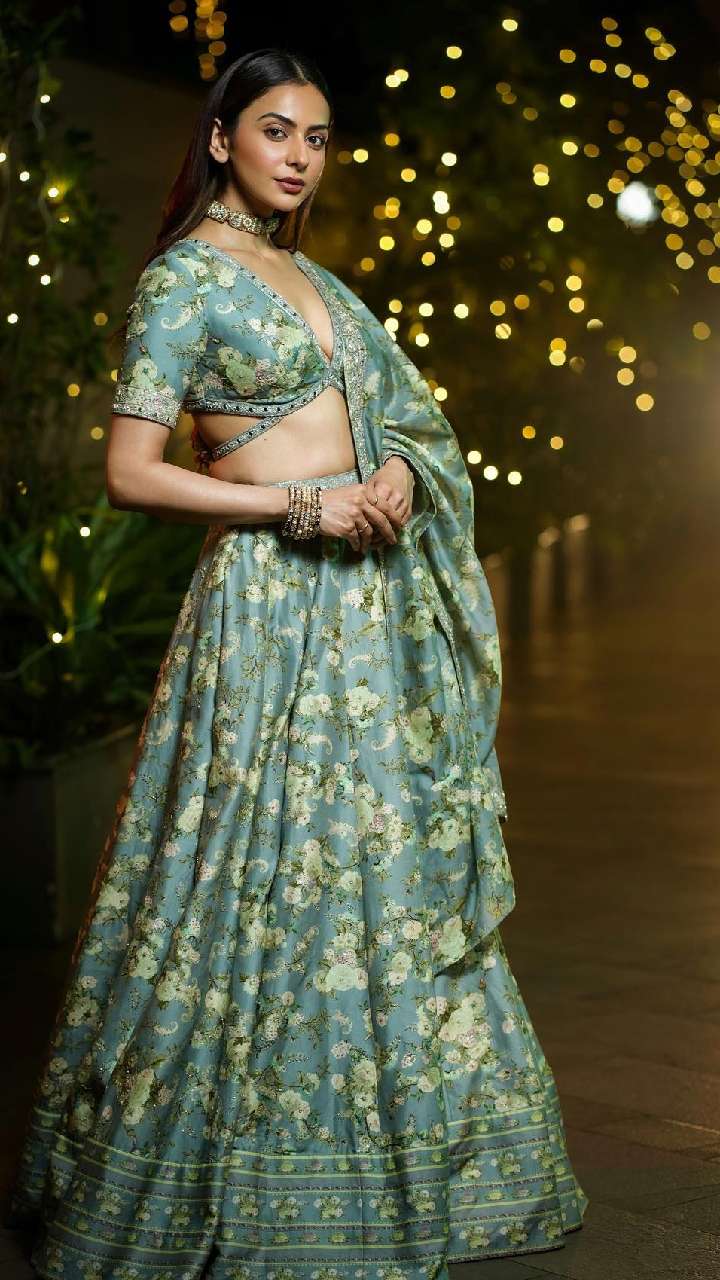 न्यूली मैरिड इस हरियाली तीज रकुल प्रीत के जैसा फ्लोरल प्रिंट सिल्क लहंगा भी ट्राई कर सकती हैं। ये उनके लुक में चार चांद लगा देगा। लहंगे के साथ डीप नेक चोली बोल्ड लुक दे रही है।