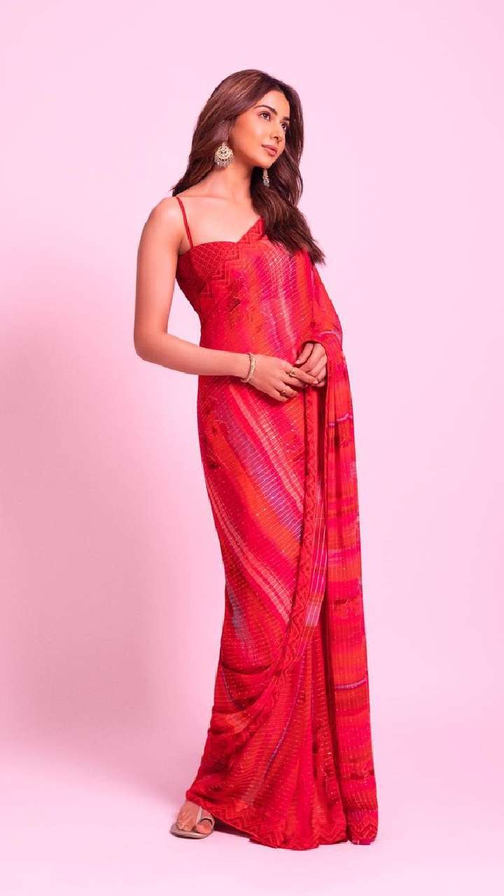 इस रेड कलर की साड़ी में रकुल प्रीत प्यारी लग रहीं हैं, इस लुक के साथ एक्ट्रेस ने ओपन हेयर किए हैं।