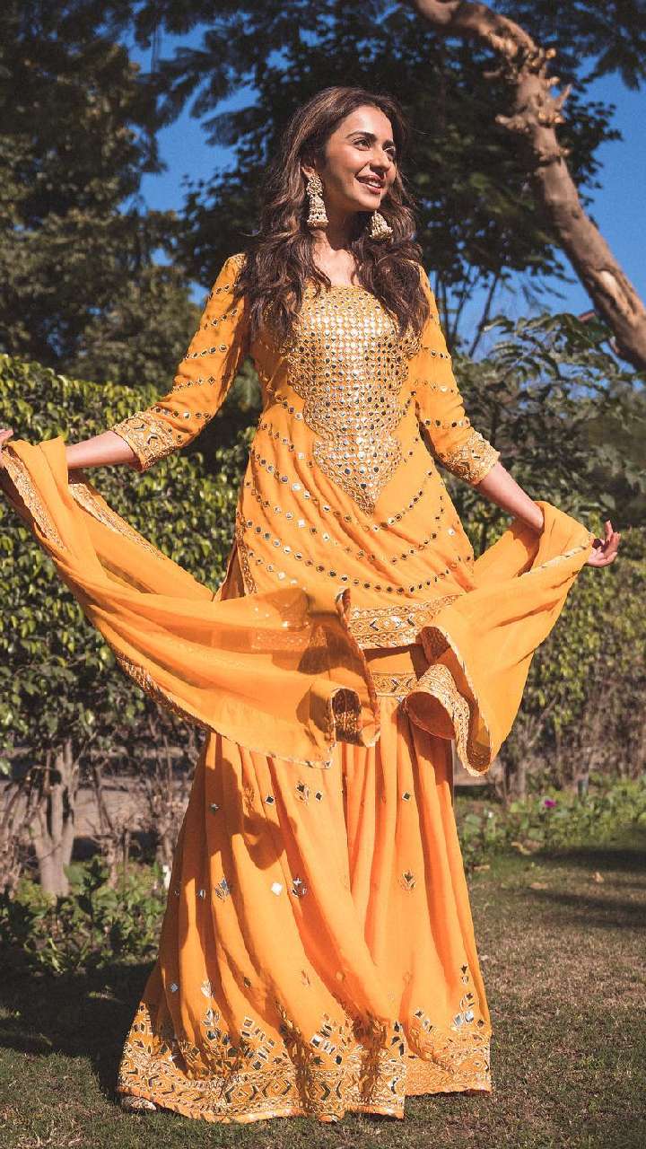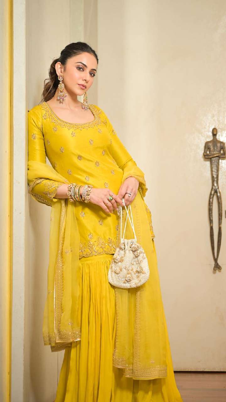 येलो कलर के गोटा वर्क शरारा सूट में एक्ट्रेस स्मार्ट लुक दे रही हैं। पूजा-पाठ में आप ऐसे सूट कैरी कर सकती हैं।