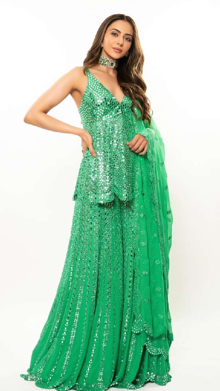 ग्रीन कलर के मिरर वर्क पेप्लम स्टाइल सूट में रकुल का ब्यूटीफुल अंदाज देखा जा सकता है। इस सूट में आपको सहेलियां देख जल उठेंगी।