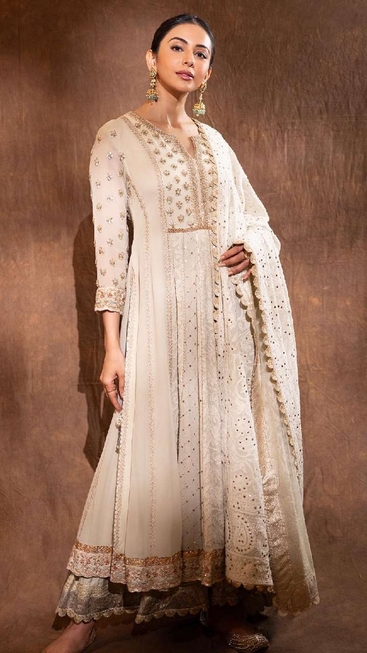 रकुल व्हाइट कलर के अनारकली सूट में एकदम अप्सरा लग रही हैं। वही इसके साथ उनका गजरा बन हेयर स्टाइल गॉर्जियस लुक दे रहा है।