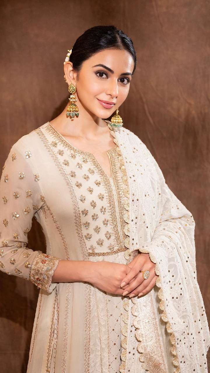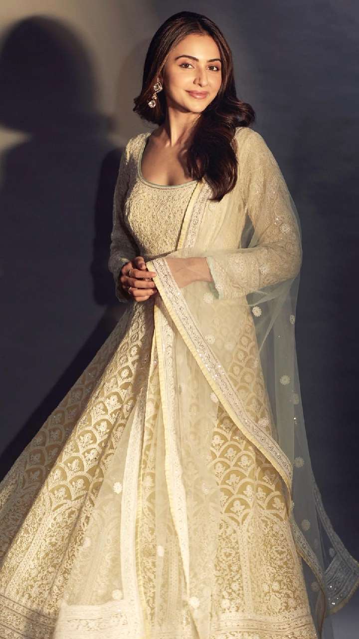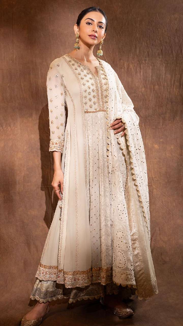 रकुल प्रीत का ऑफ व्हाइट हेवी अनारकली सूट किसी भी वेडिंग फंक्शन के लिए बेस्ट रहेगा। ये लुक यंग गर्ल्स के लुक में चार चांद लगा देगा।