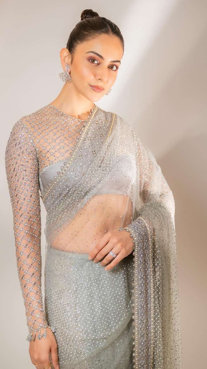 हाल में रकुल प्रीत ने सिल्वर कलर की ट्रांसपेरेंट साड़ी विद पर्ल बॉर्डर में अपना ब्यूटीफुल लुक शेयर किया है। इसके साथ डीवा ने जीरो नेक ब्लाउज से खुद को स्मार्ट बनाया हुआ है।