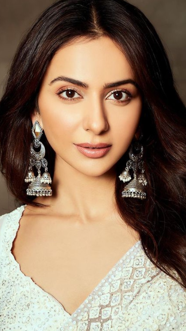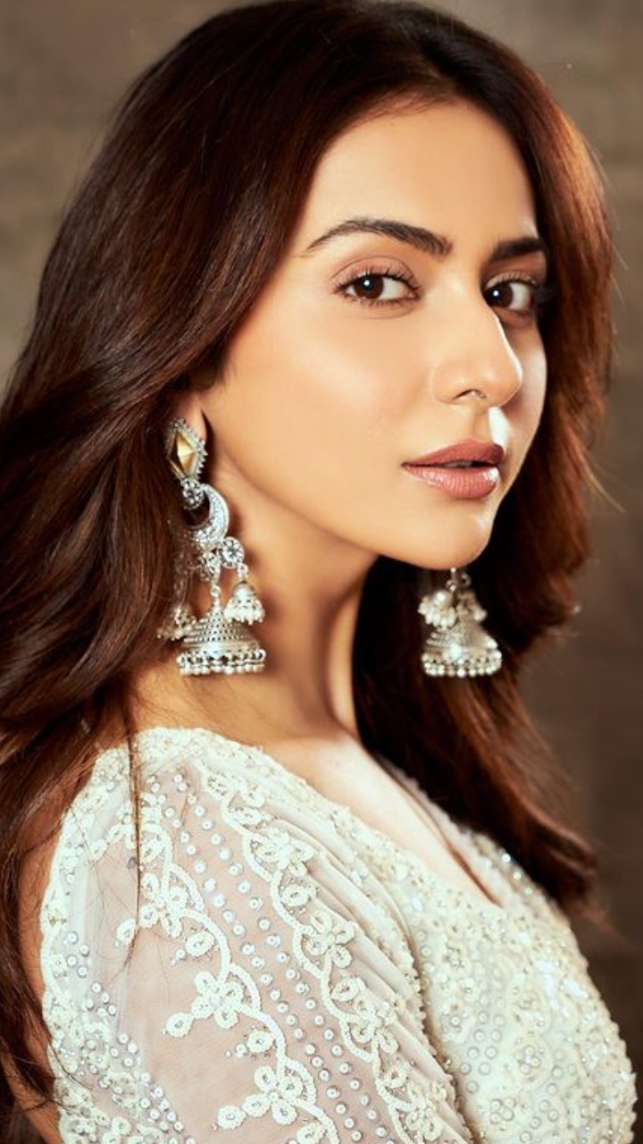 एक्ट्रेस ने व्हाइट साड़ी के साथ झुमके पहने है, जो रकुल के लुक को खास बना रहा हैं।