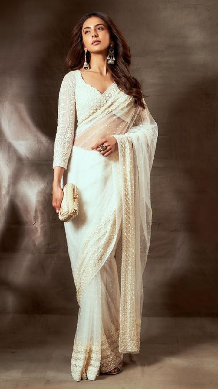 बॉलीवुड एक्ट्रेस रकुल प्रीत सिंह इस व्हाइट कलर की साड़ी में बेहद प्यारी लग रही हैं।