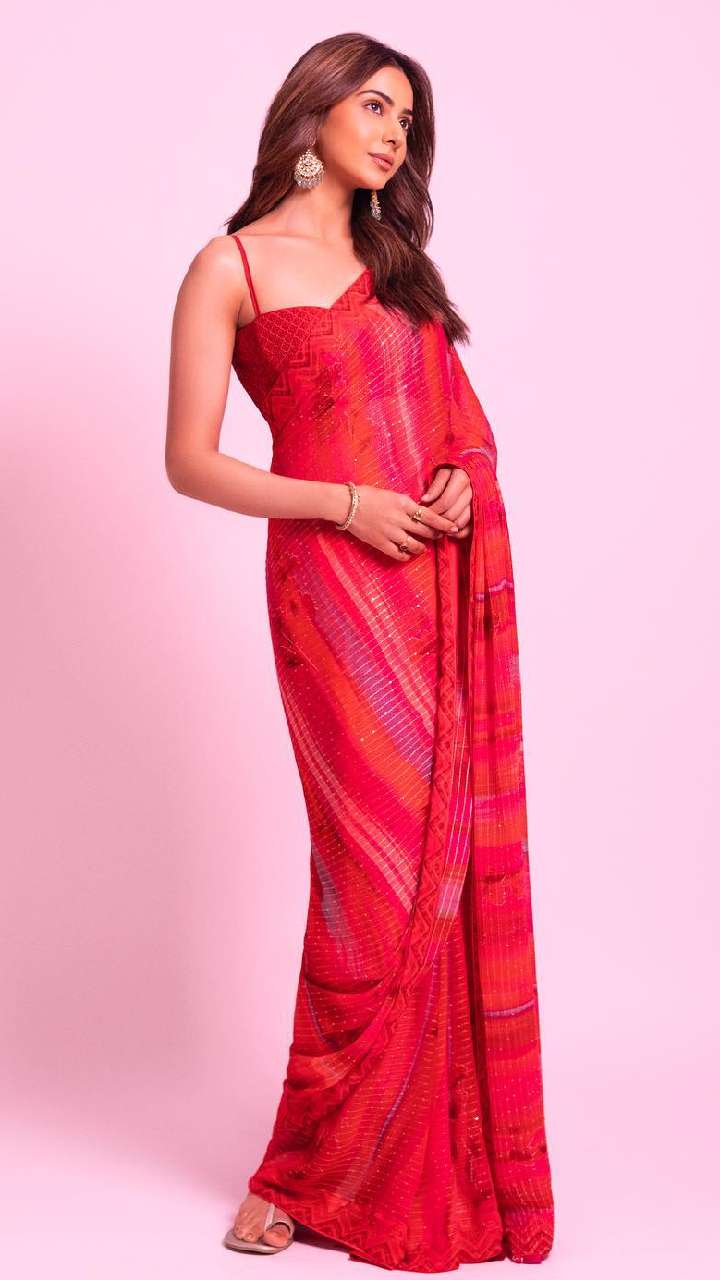 इस वैलेंटाइन रेड कलर पहनना चाहती हैं, तो एक्ट्रेस के इस लुक को रीक्रिएट जरूर करें। रकुल ने ब्रालेट ब्लाउज के साथ प्लेन साड़ी स्टाइल की है, जिसमें वह बहुत हॉट लग रही हैं।