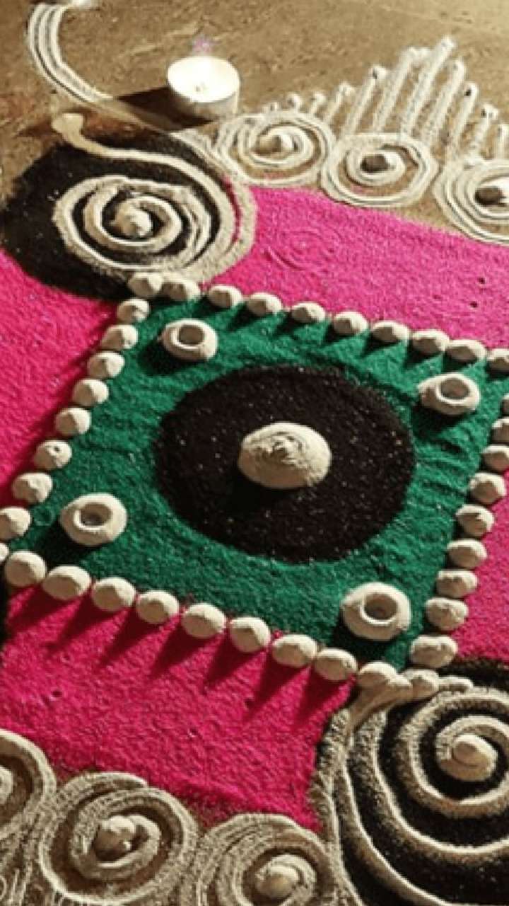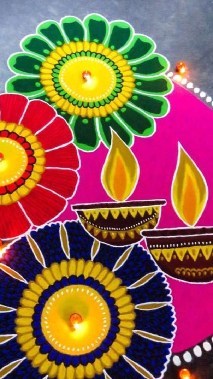 अगर आपके पास समय बहुत ही ज्यादा कम है तो आप फटाफट इस तरह की दीये वाली रंगोली बनाएं।