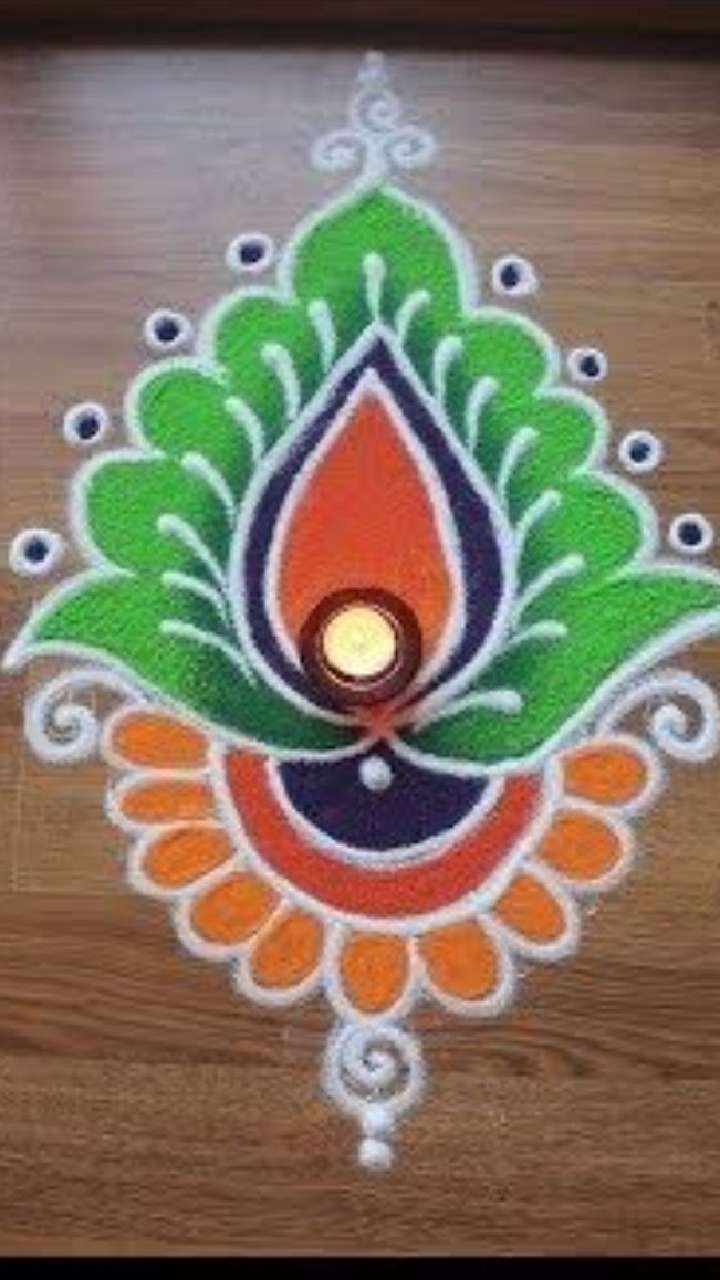 कमल और दीये की डिजाइन वाली ये रंगोली आप बहुत ही आसानी से और कम समय में बना सकती हैं।