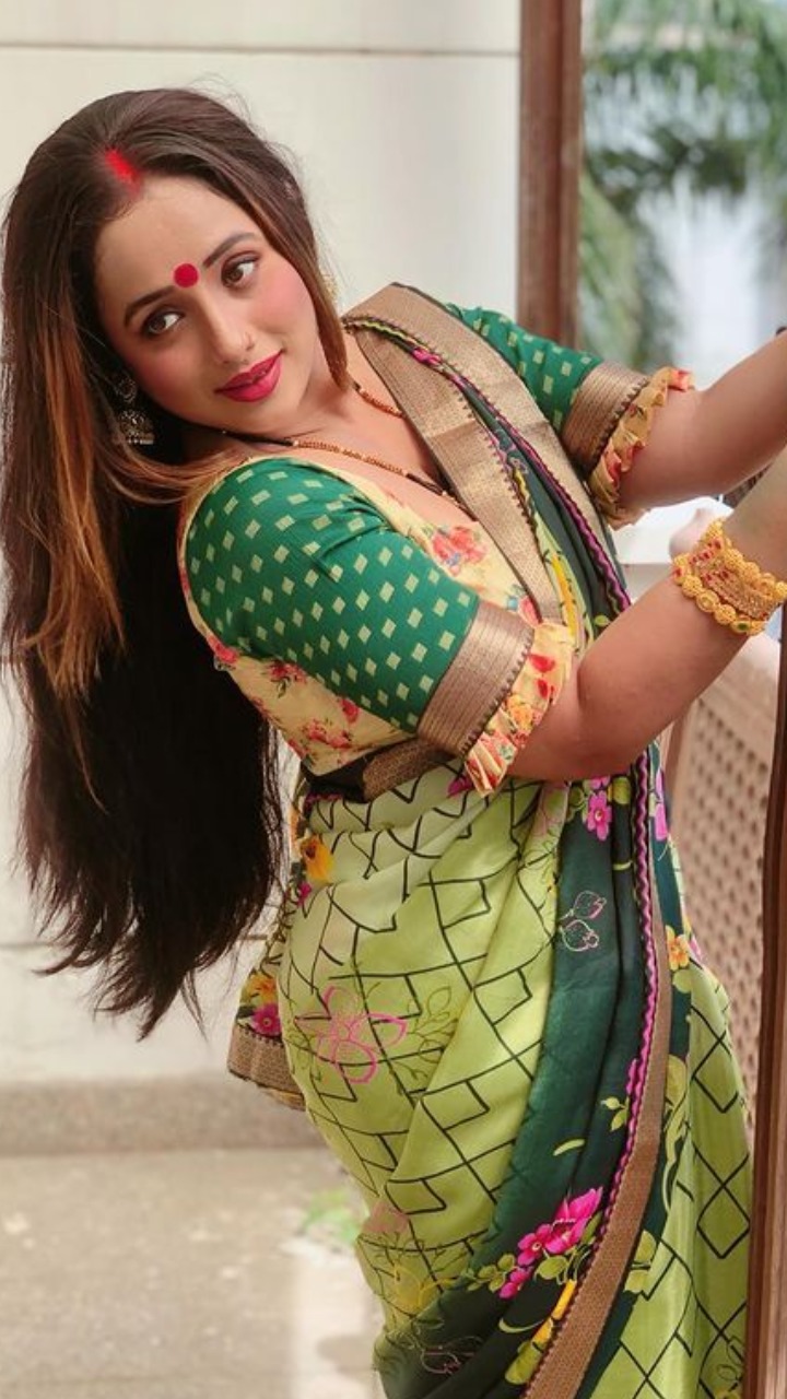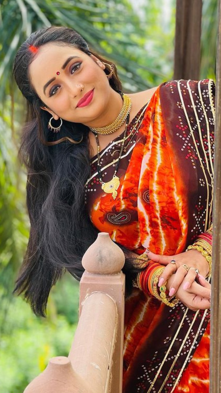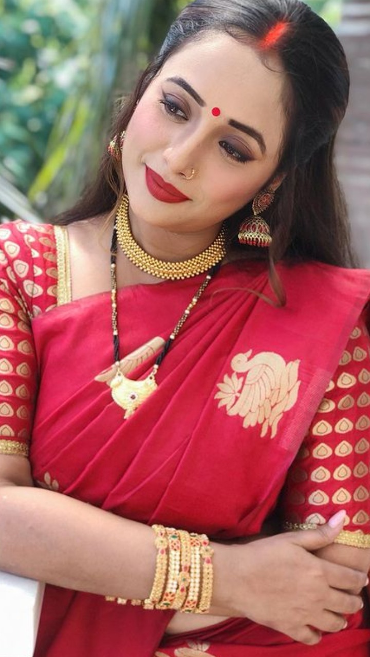 भोजपुरी फेम ने फोटो में रेड साड़ी और हाथों में कंगन और कानों में झुमका पहना हुआ हैं।