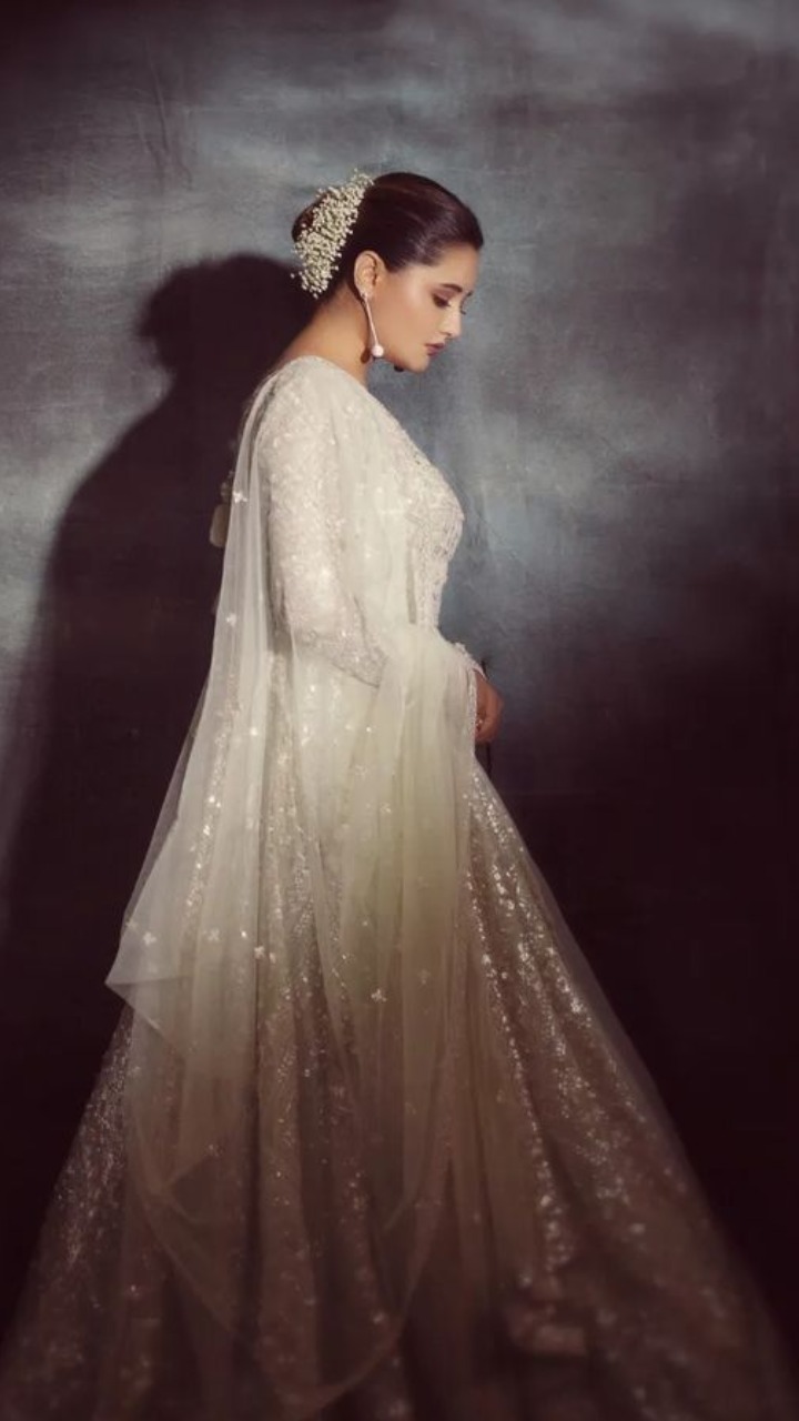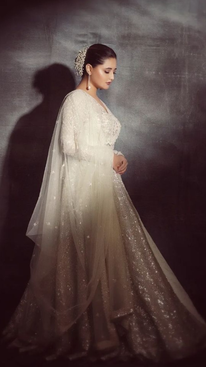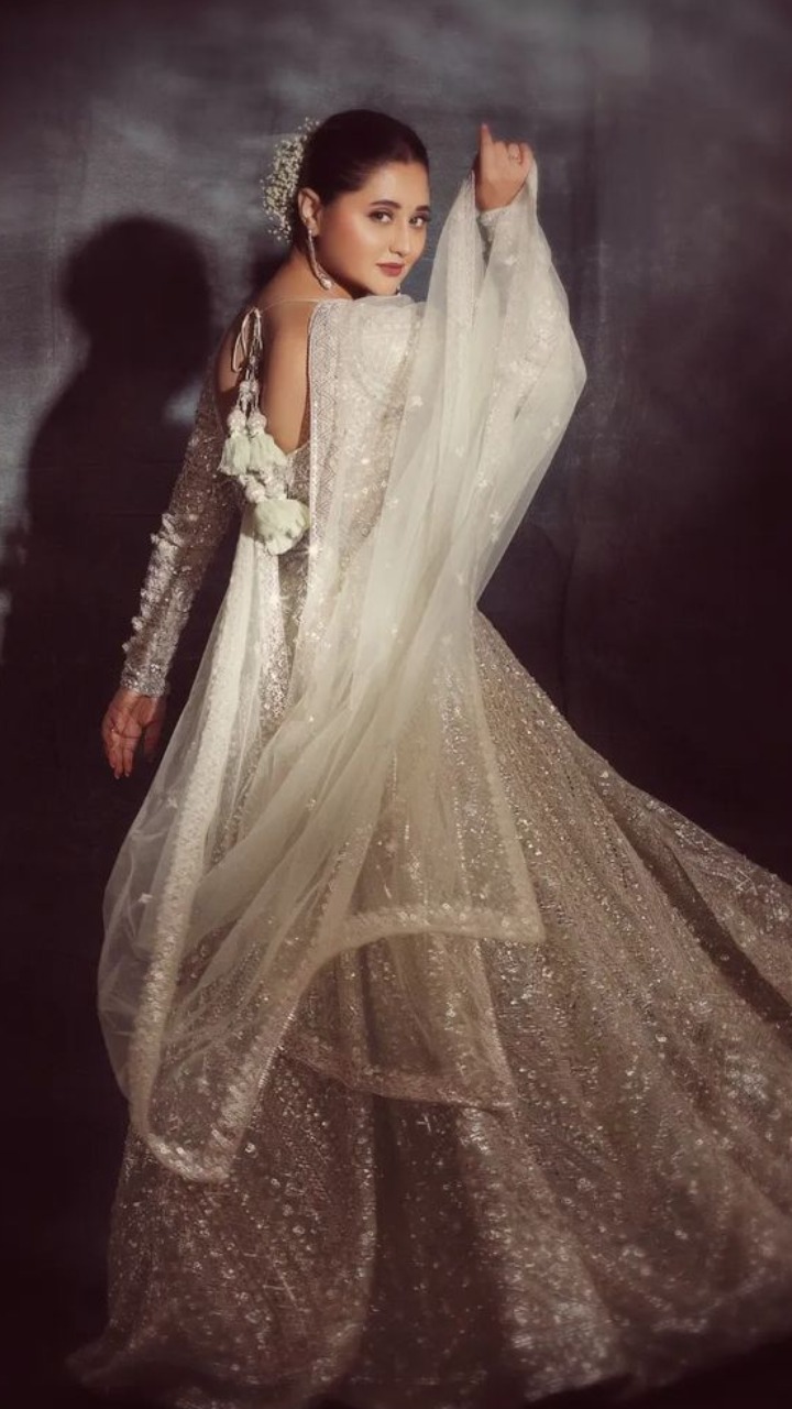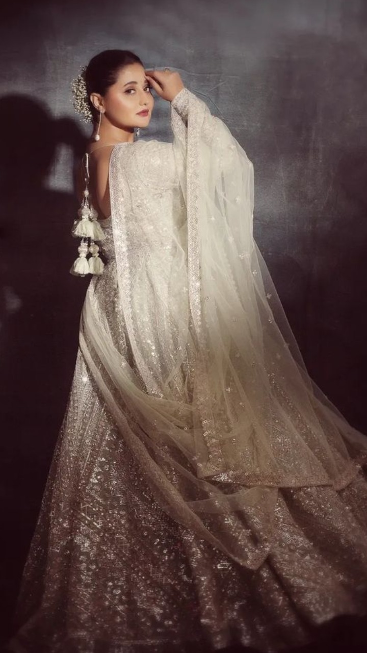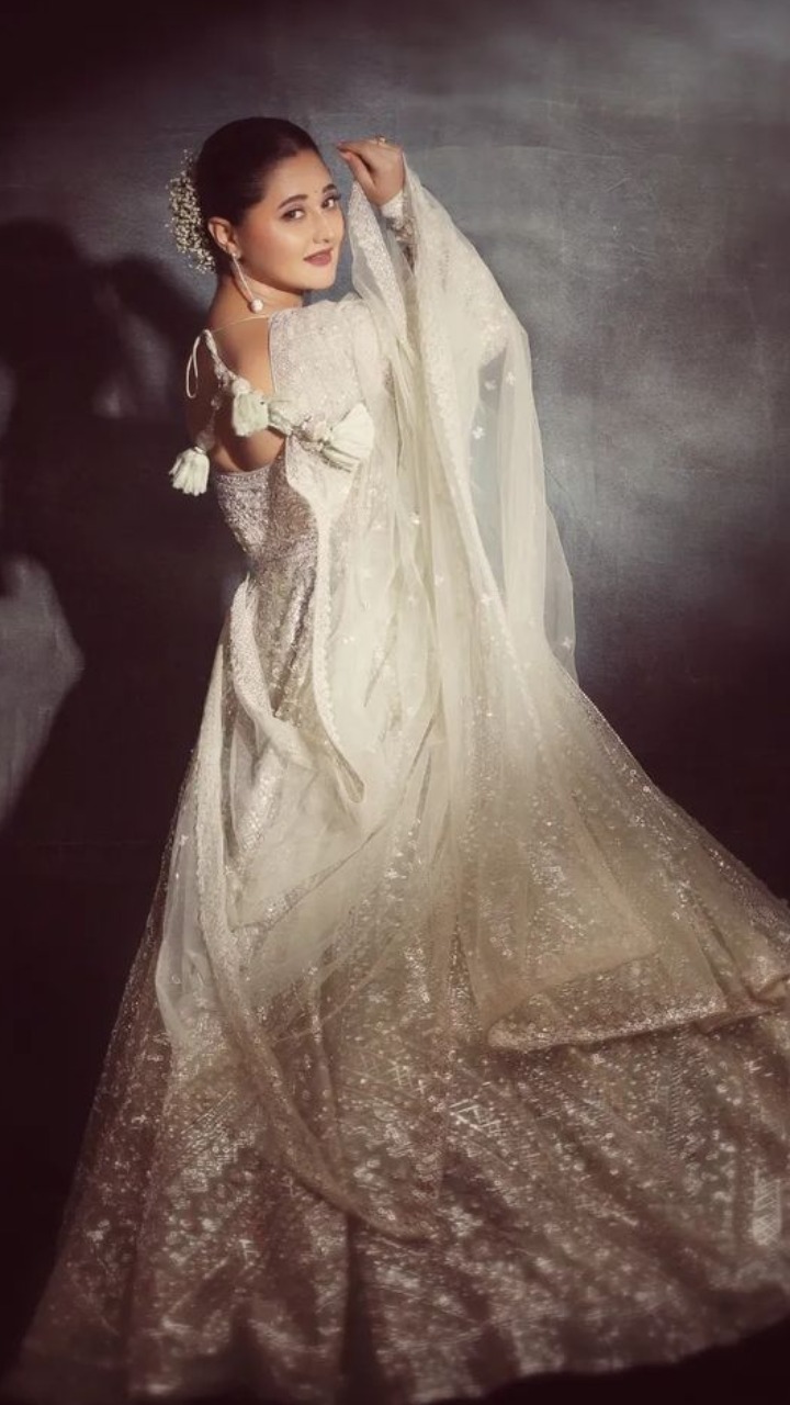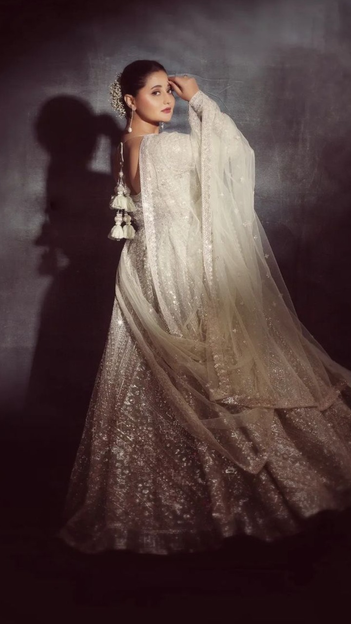 रश्मि देसाई इस सफेद कलर के शिमरी अनारकली सूट में बेहद प्रिटी लग रही हैं।