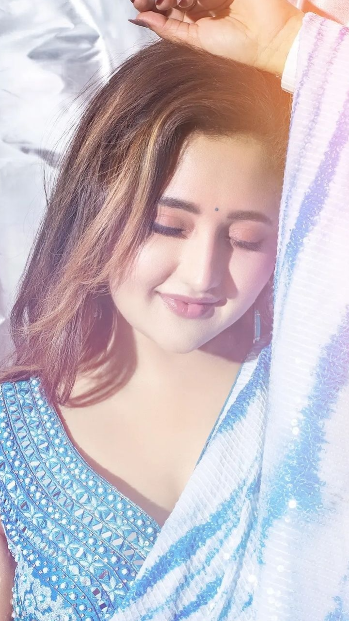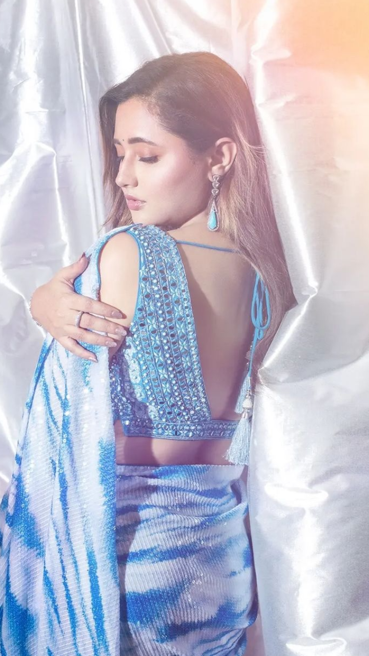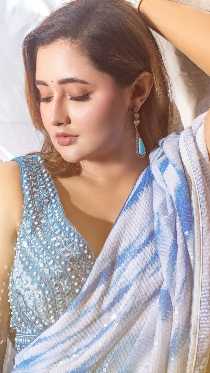 रश्मि इस ब्लू वाइट कलर की सिंपल साडी में भी बेहद ब्यूटिफुल दिख रही थीं। एक्ट्रेस ने सिंपल साडी संग हेवी मिरर वर्क ब्लाउज पहना था।