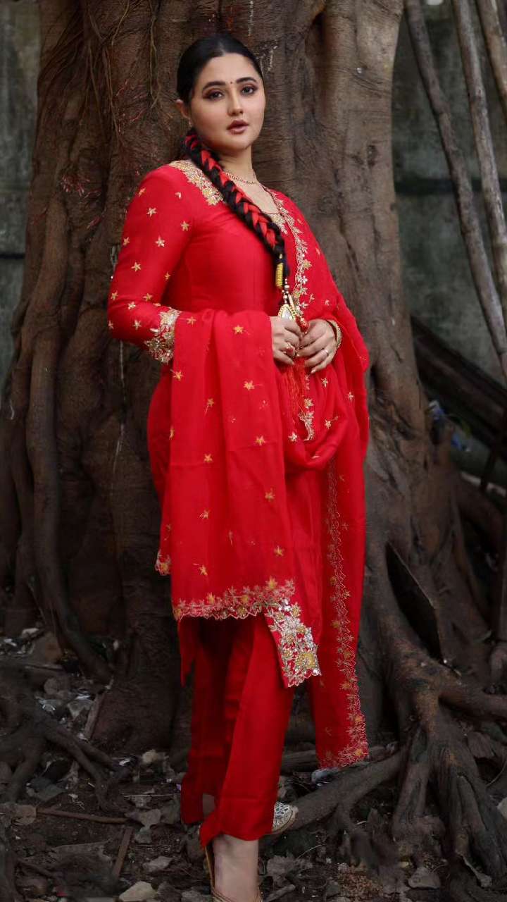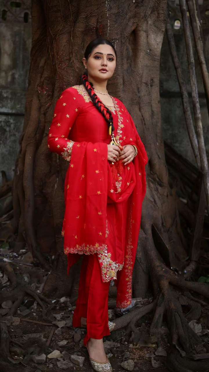 इस रेड कलर के सूट में रश्मि देसाई का लुक काफी ज्यादा शानदार लग रहा है। इस आउटफिट में एक्ट्रेस पंजाबी कुडी लग रहीं हैं।
