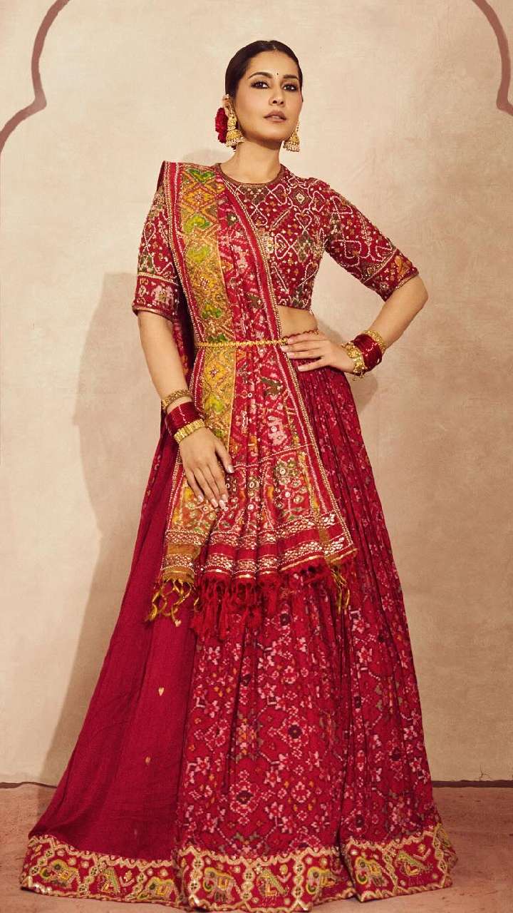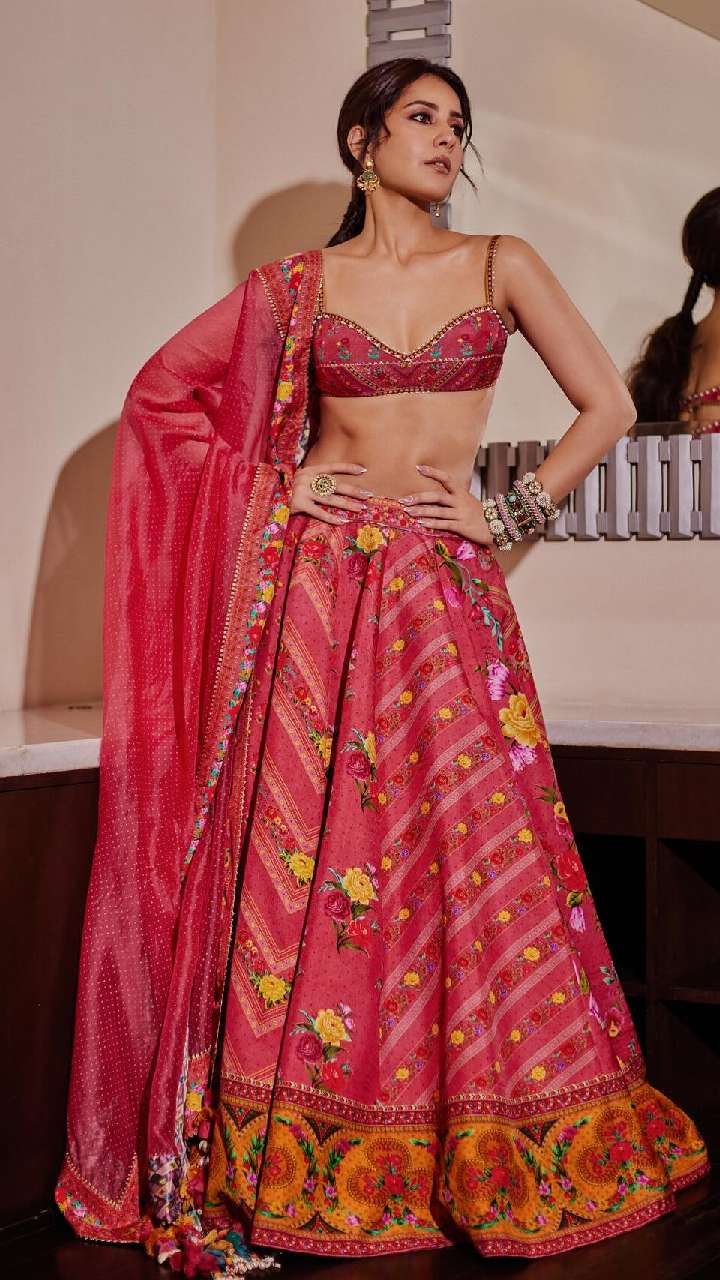 अगर आप हैवी लहंगा पहनना पसंद नहीं करती हैं, तो आप राशि की तरह ही प्रिंटेड लहंगा ट्राई कर सकती हैं। ऐसे लहंगे शादी सीजन में शानदार लुक देती हैं।