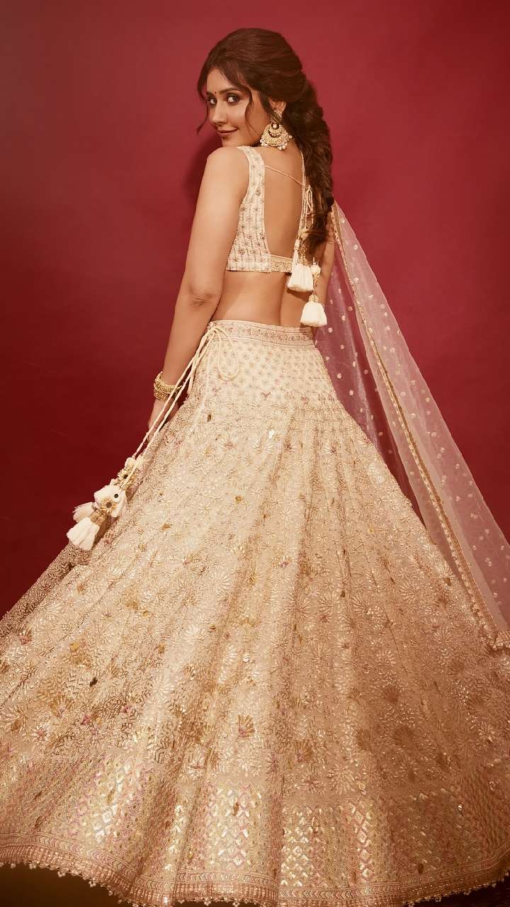 एक्ट्रेस क्रीम कलर के गोल्डन वर्क नेटिड लहंगा विद कंट्रास्ट नेटिड दुपट्टा में काफी रॉयल लुक दे रही हैं। आप भी शादी-फंक्शन में इस तरह के लहंगे को स्टाइल करके शानदार लुक पा सकती हैं।