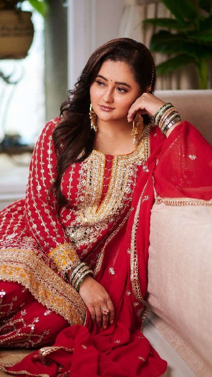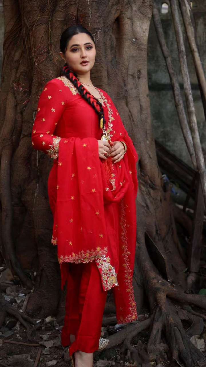 रेड कलर के प्लेन सूट में भी रश्मि देसाई का लुक बहुत प्यारा लग रहा है। यंग गर्ल्स पर इस तरह का सूट खूब जंचेगा।