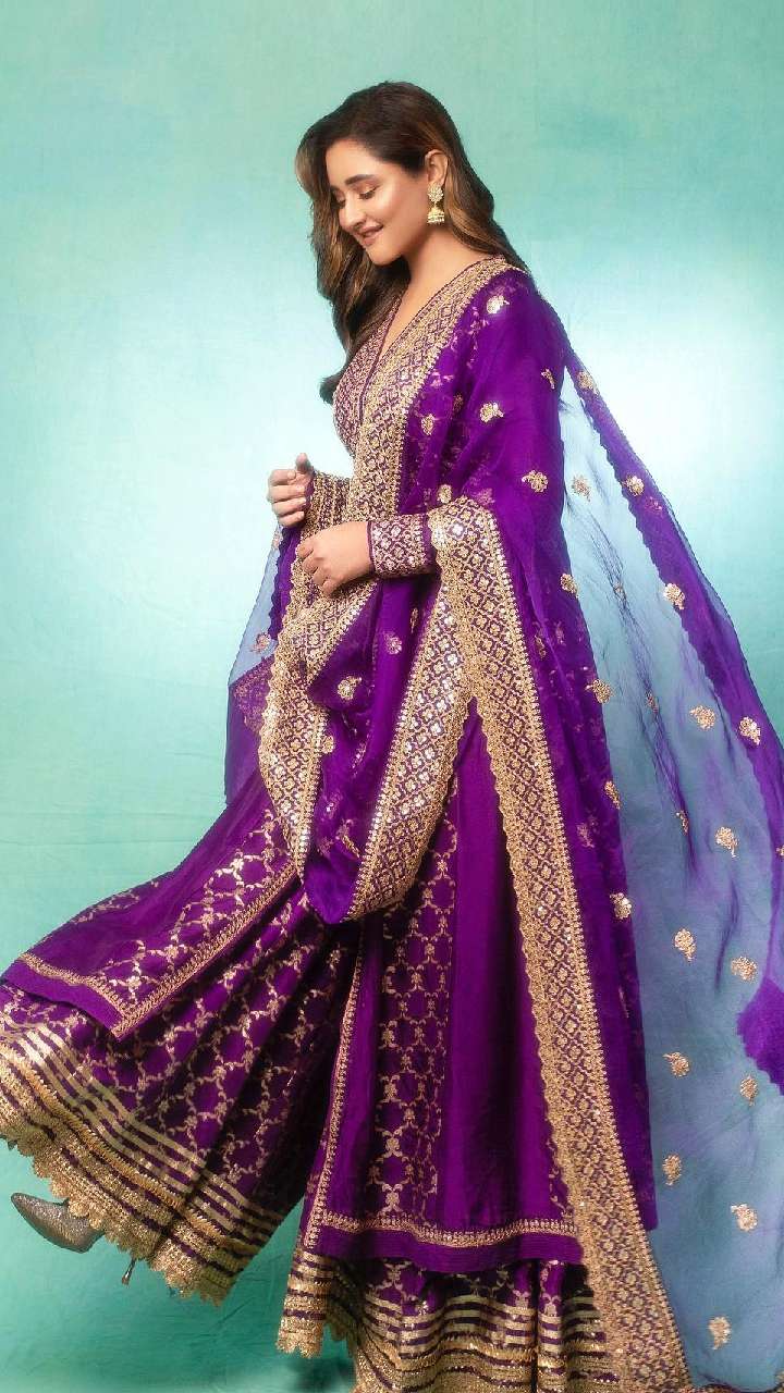 फिलहाल शरारा पैटर्न सूट डिजाइन काफी ज्यादा ट्रेंड में चल रहे हैं। आप भी रश्मि देसाई के इस पर्पल शरारा सूट को कॉपी कर सकती हैं।