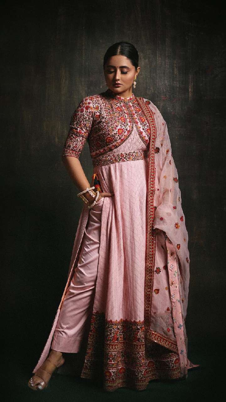 पिंक कलर के इस साइड कट सूट में रश्मि देसाई का लुक शानदार लग रहा है। आप भी इस तरह के सूट को पहन सकती हैं।